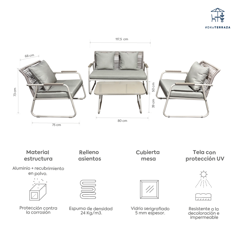 Cuenta con estructura de acero con pintura electrostática, respaldo de ratán y mesa con cubierta de vidrio serigrafiado de 5 mm, aportando resistencia y estilo. Sus cojines de poliéster mezclado con espuma densidad 24 kg/m³ entregan comodidad y soporte en cada uso.