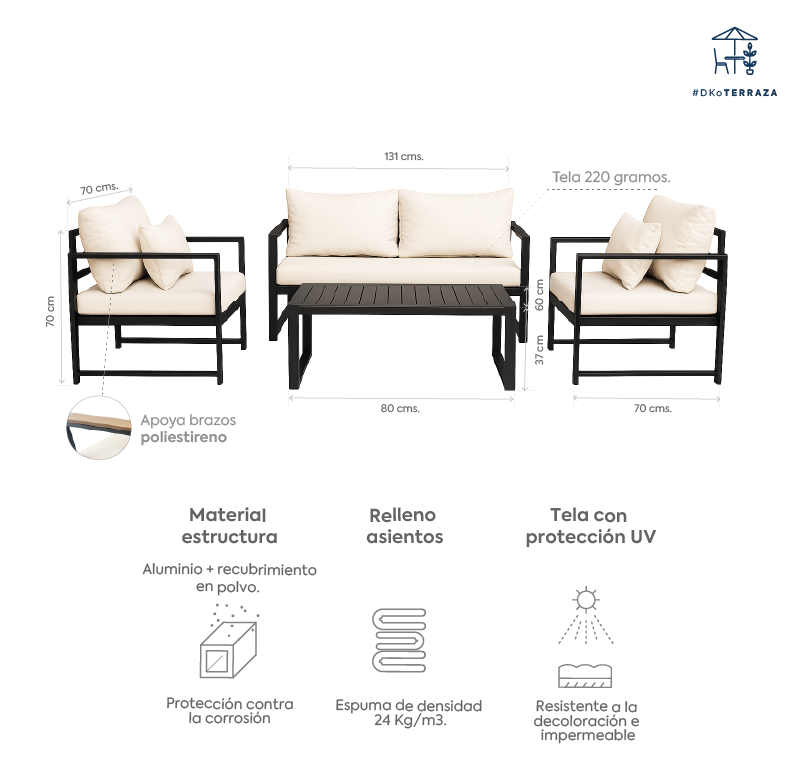 Fabricado con estructura de aluminio, incorpora cojines de poliéster 220g con 10 cm de espesor y detalles en listones de PS en los brazos, entregando un look contemporáneo y resistente. Incluye sofá 2 cuerpos, dos sillones individuales y mesa, ideal para disfrutar reuniones y momentos de descanso.