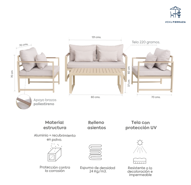 Cuenta con estructura de aluminio, cojines de poliéster 220g con 10 cm de espesor y detalles en listones de PS en los brazos, combinando resistencia y diseño. Incluye sofá de 2 cuerpos, dos sillones individuales y mesa, perfecto para reuniones y momentos de descanso.