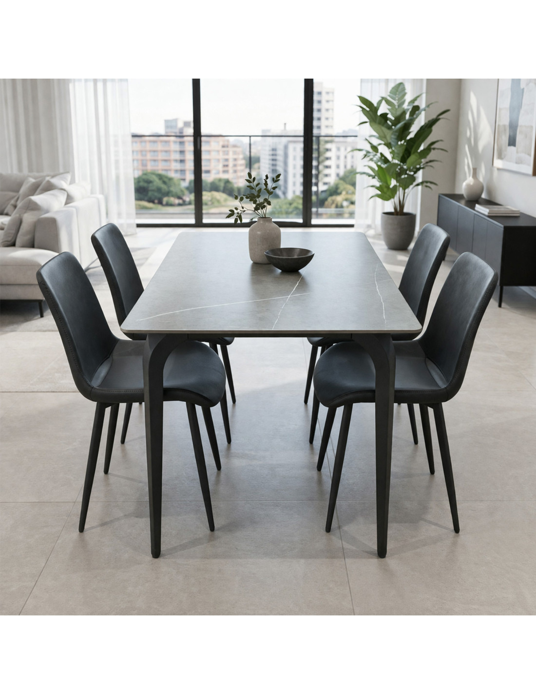 Juego de comedor con mesa de cubierta cerámica, patas de metal y sillas tapizadas en eco cuero, ideal para aportar estilo y funcionalidad a tu comedor.