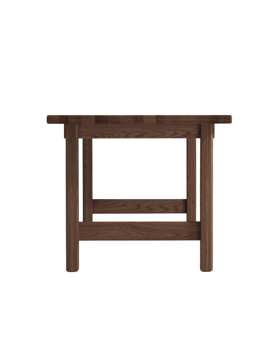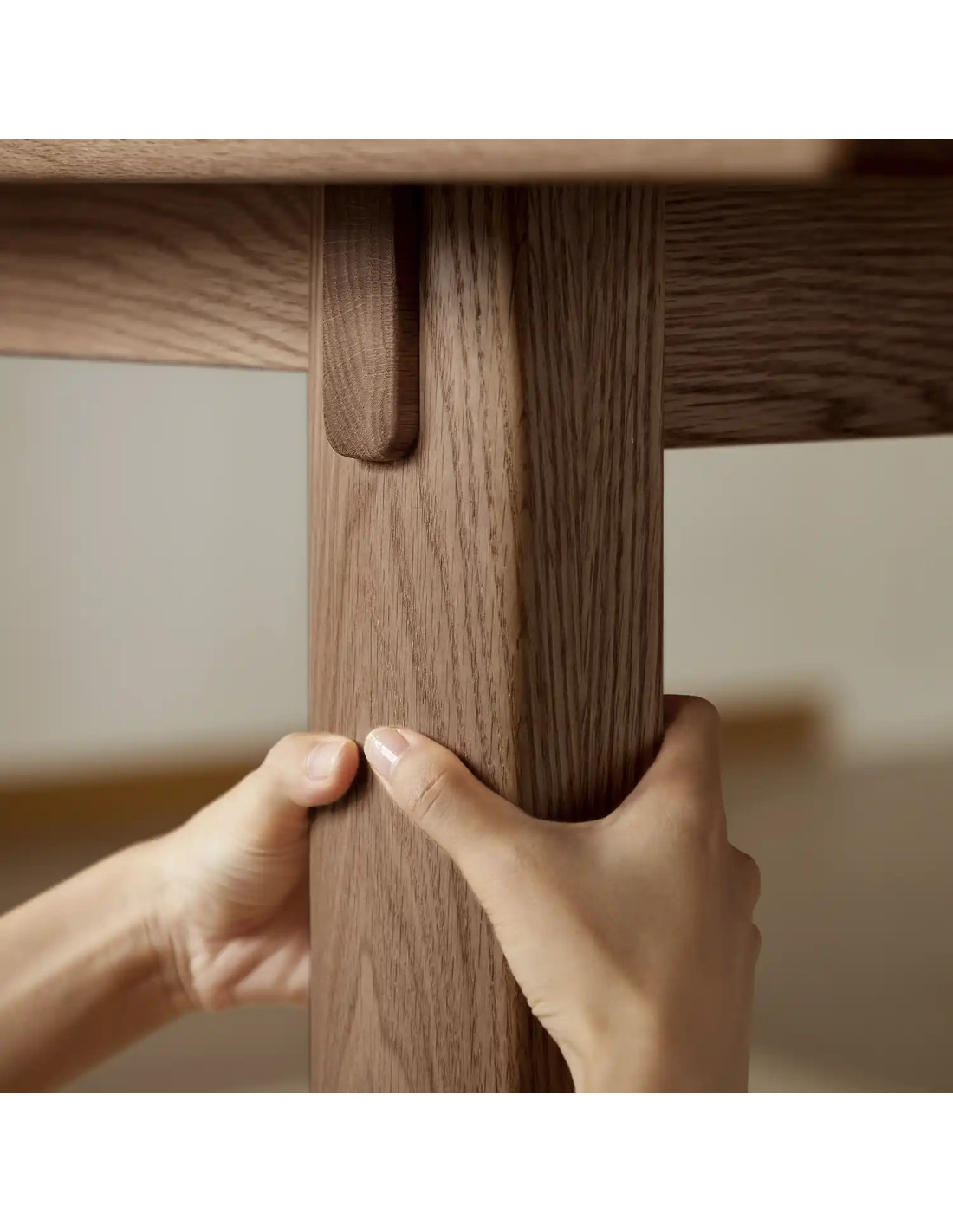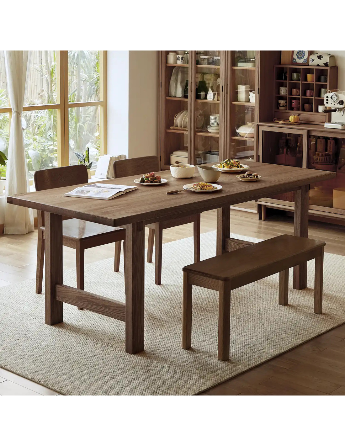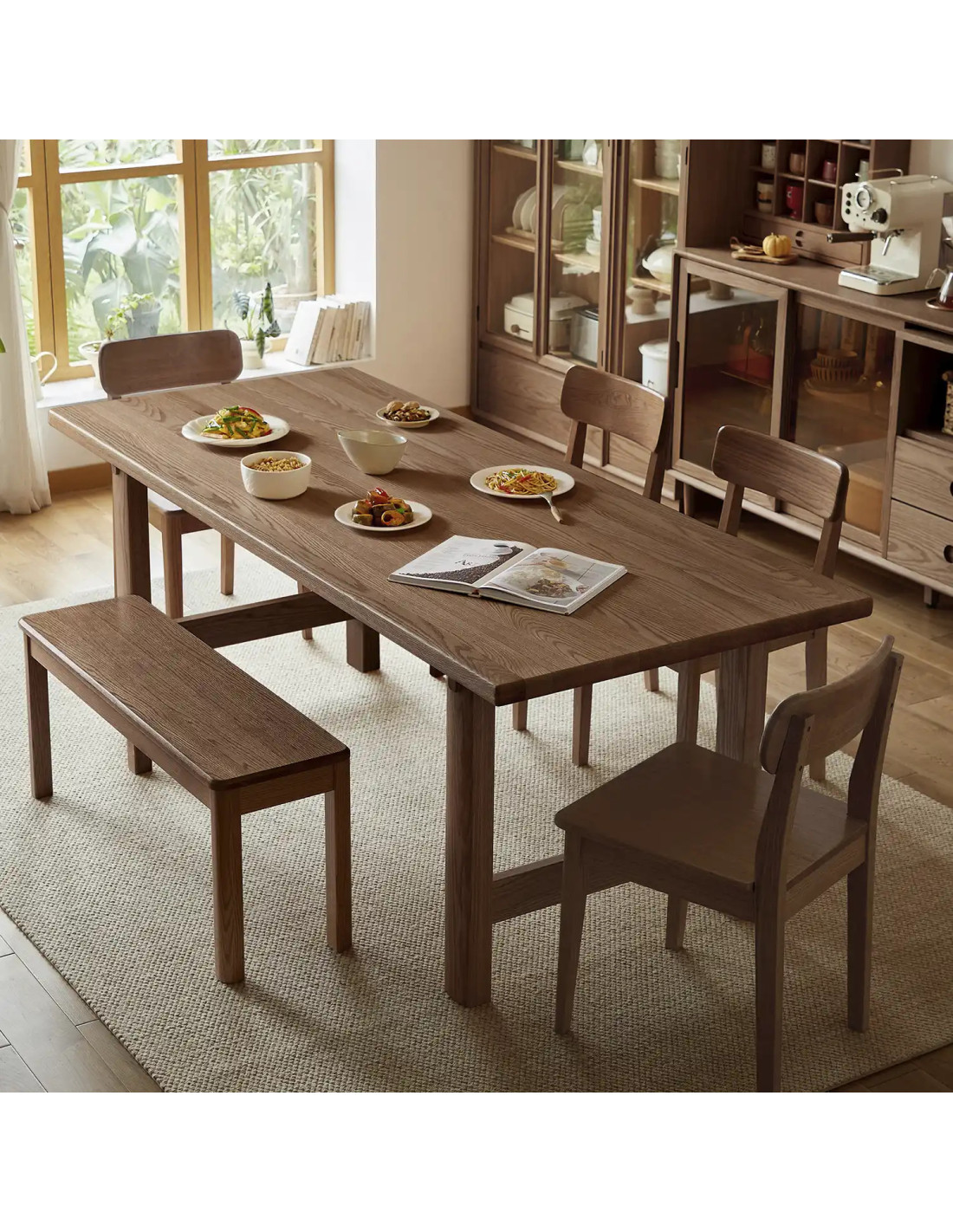 Fabricada en roble rojo norteamericano, cuenta con una estructura firme y un travesaño horizontal con barra metálica de refuerzo que aporta mayor estabilidad y soporte en el uso diario. Su diseño combina calidez visual, resistencia y funcionalidad, convirtiéndola en una excelente opción para acompañar comidas, reuniones y momentos cotidianos en casa.
