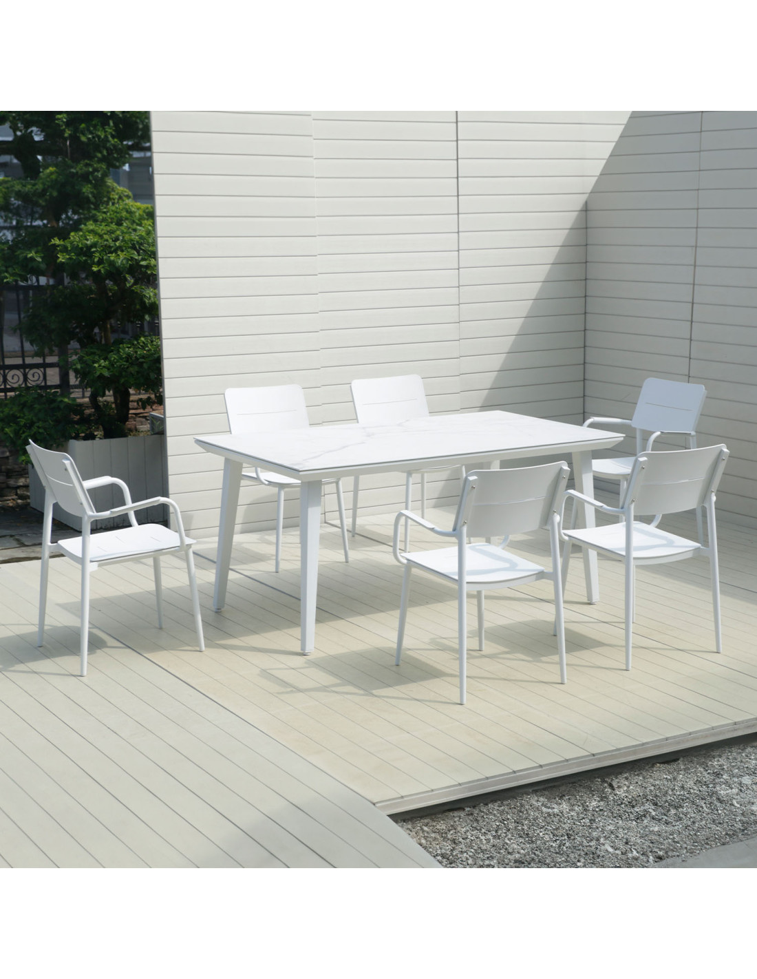 Mesa Granada blanca, diseño moderno y resistente que aporta luminosidad y amplitud a tu terraza.