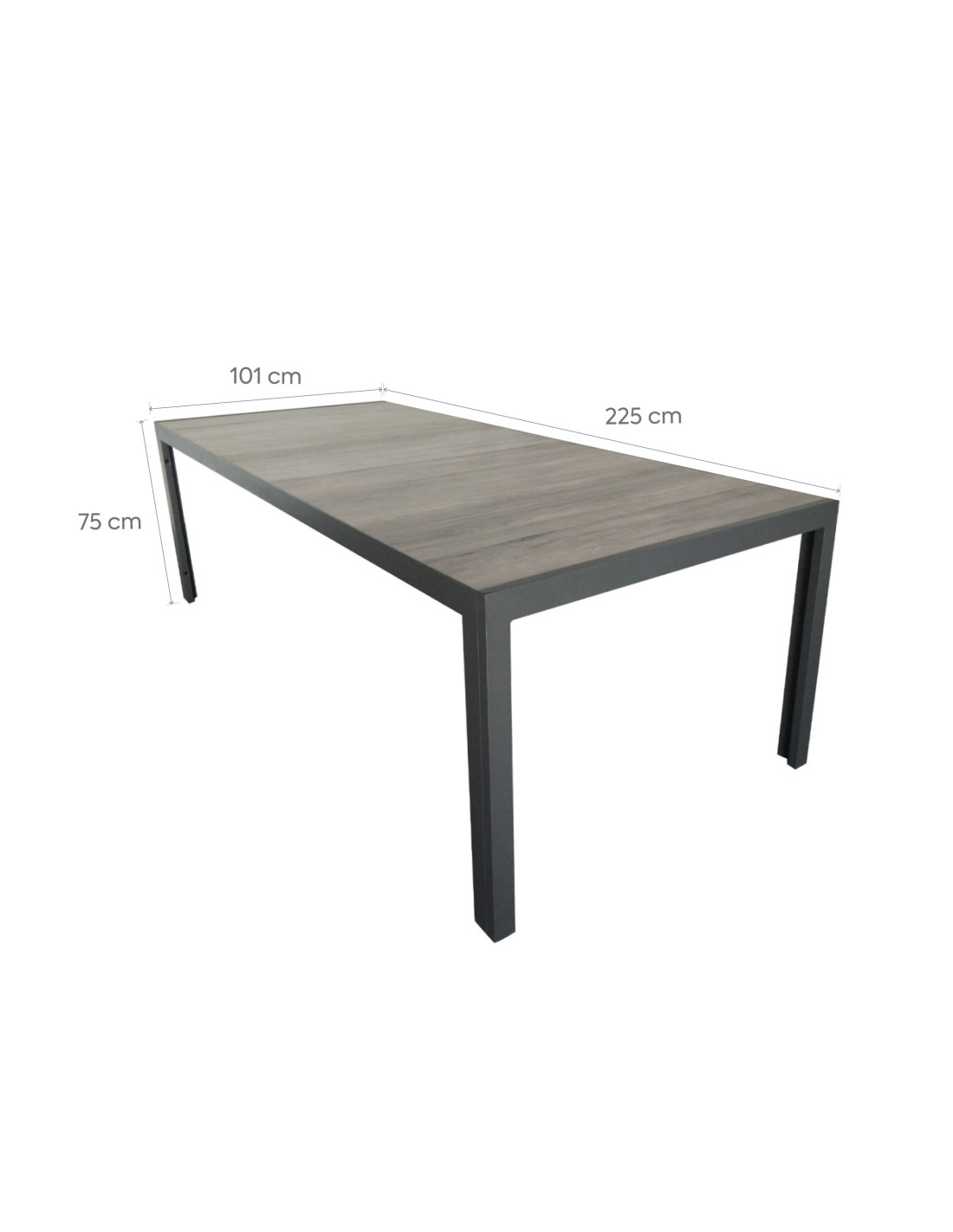 La Mesa Terraza Lazio de 225cm es la combinación perfecta de estilo y funcionalidad para transformar tu espacio al aire libre en un refugio de sofisticación. Con su marco de aluminio ligero y resistente, esta mesa para terraza es ideal para embellecer tu patio con un toque moderno. La superficie de cerámica en color gris no solo añade un aire de elegancia, sino que también ofrece durabilidad y fácil mantenimiento, integrándose de manera natural en cualquier decoración exterior. Esta mesa de aluminio se convierte en el centro de tus momentos al aire libre, elevando la experiencia de disfrutar de un entorno cómodo y contemporáneo.
