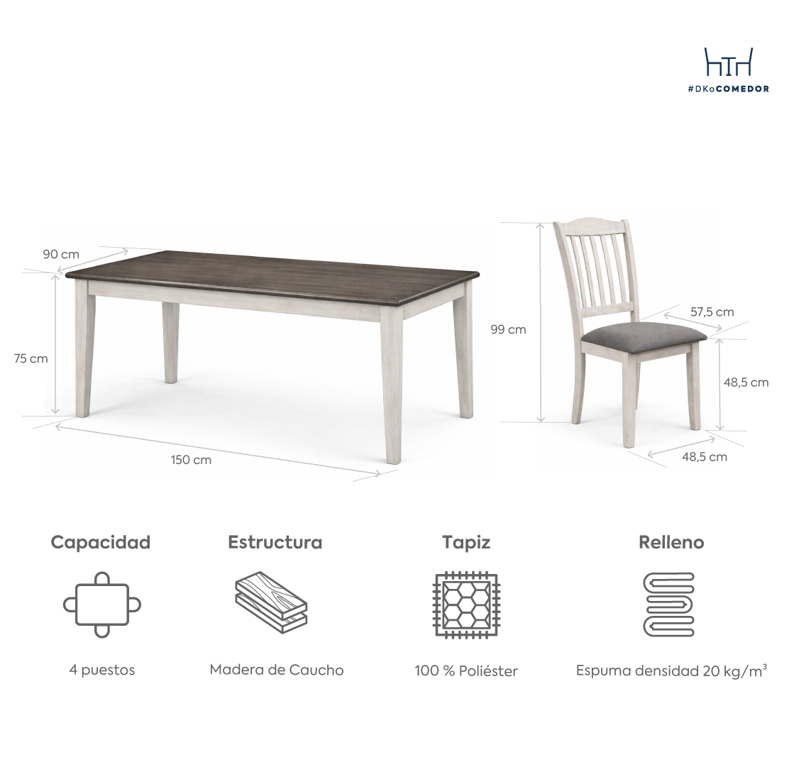 Con cubierta enchapada en madera de Okume, estructura de madera de caucho y asientos con relleno de espuma D20, este comedor combina firmeza, comodidad y estilo para acompañar tu día a día con elegancia y funcionalidad.