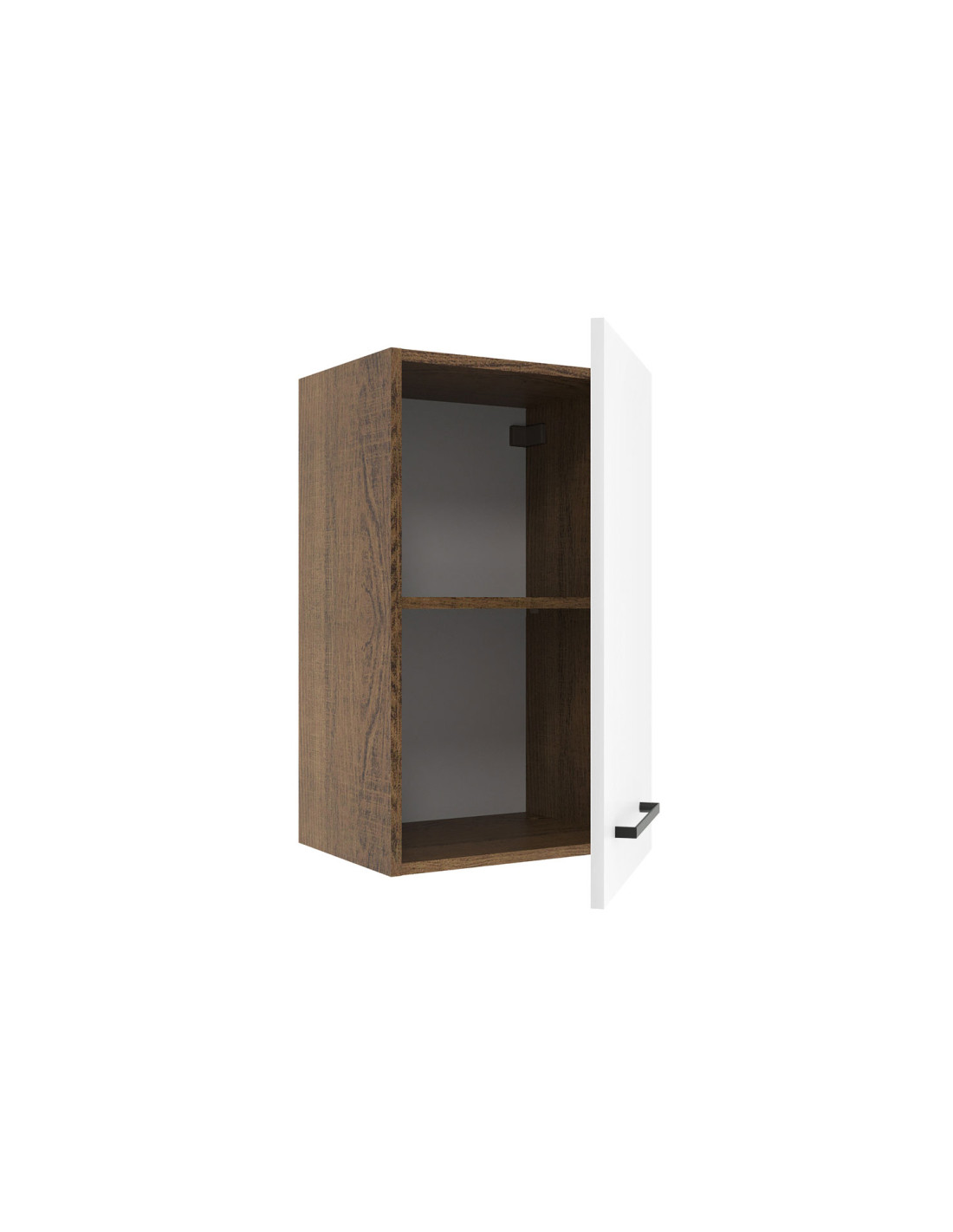 El Aéreo cocina Agata blanco 1 puerta 40cm es la opción perfecta para quienes buscan un toque de elegancia y funcionalidad en su cocina. Su puerta convencional, con bisagras metálicas de cierre suave, y manijas de aluminio aseguran un uso cómodo y duradero. El espacio interno con estante es ideal para almacenar vajilla, comestibles y más, mientras que su acabado en madera rústica y puerta blanca, protegida por una pintura Poliéster de 7 capas, garantiza resistencia al alcohol, agua y calor. Este mueble se combina fácilmente con otros módulos de la línea Agata, aportando armonía y practicidad a tu cocina.
