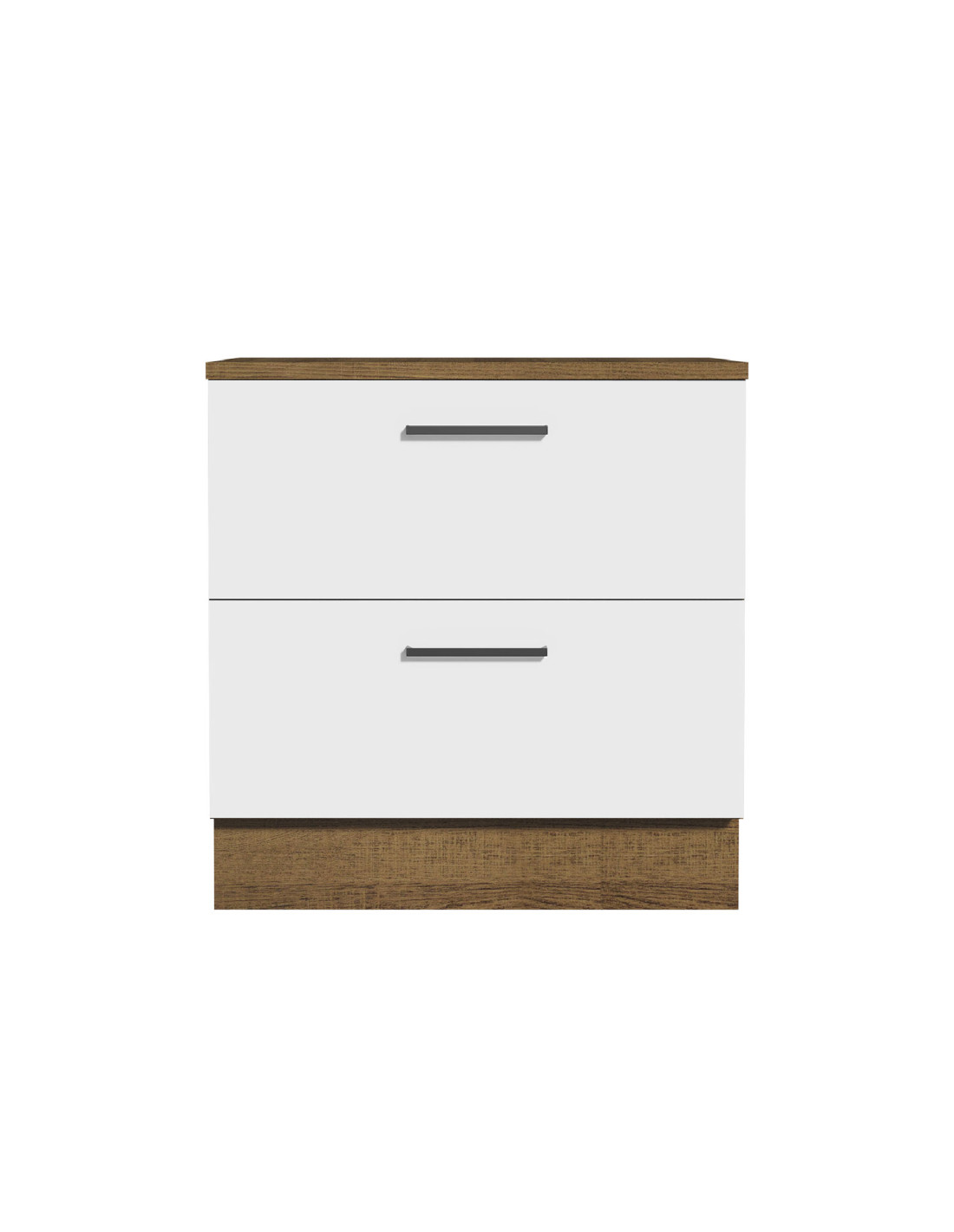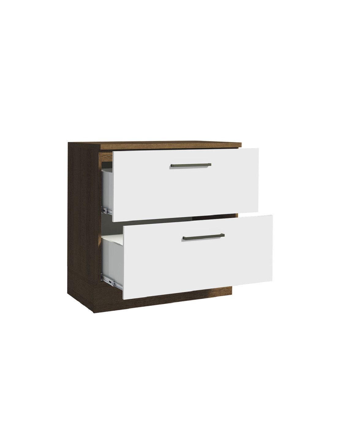 De estética limpia y funcional, esta base con dos cajones mantiene todo organizado. Su acabado blanco aporta claridad y equilibrio.