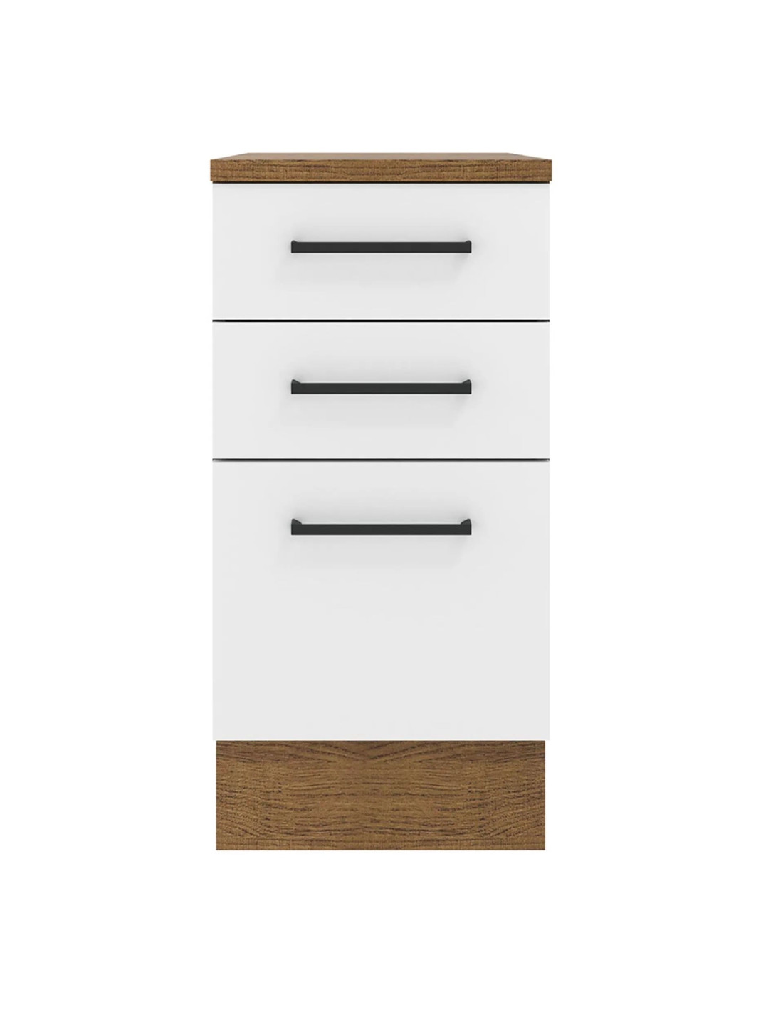 La Base cocina Agata blanco 3 cajones 40cm es el mueble perfecto para una cocina organizada y funcional. Con tres cajones, incluyendo uno más profundo para almacenar vajilla y utensilios, este mostrador ofrece comodidad y eficiencia. Fabricado con materiales de alta calidad, cuenta con tiradores de aluminio y correderas telescópicas para un uso fluido. Su diseño modular, en madera rústica con frentes blancos, se adapta a diferentes combinaciones, mientras que su pintura Poliéster de 7 capas garantiza durabilidad y protección.