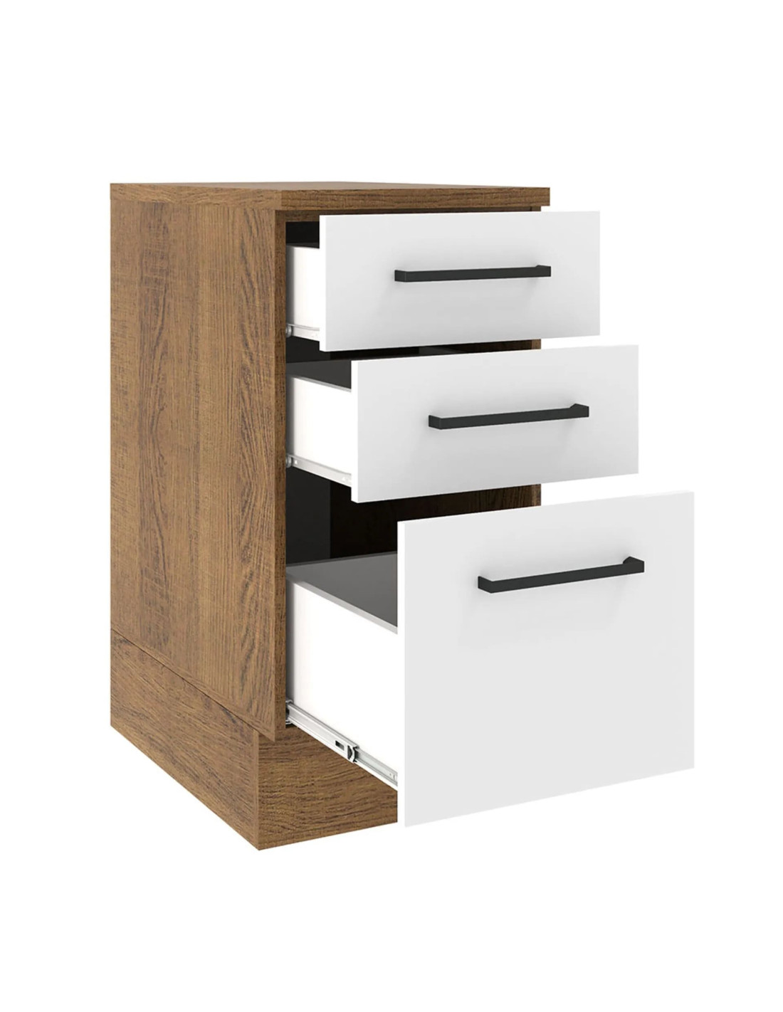 Compacta y práctica, esta base de tres cajones organiza tus utensilios con estilo. Su acabado blanco refleja orden y modernidad.