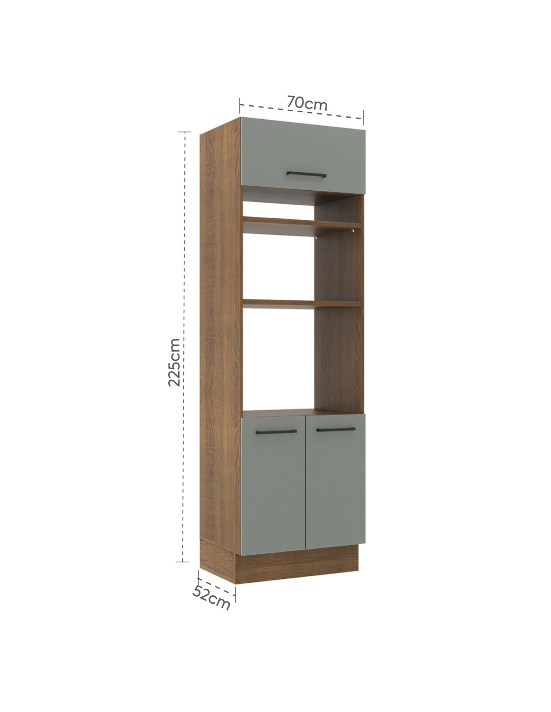 El mueble horno Agata gris de 70 cm es la opción ideal para quienes buscan un toque de elegancia y funcionalidad en su cocina. Con dos puertas batientes y una puerta basculante con bisagra hidráulica, todas con cierre suave y tiradores de aluminio, ofrece un acceso fácil y cómodo a su amplio espacio interior. Perfecto para guardar utensilios, vajilla o pequeños electrodomésticos, su diseño incluye dos espacios para horno o microondas (47 cm x 67 cm), con apertura para salida de calor. Su acabado en madera rústica, puertas grises y el interior blanco brindan un estilo acogedor y moderno. Además, sus patas de PVC regulables y el zócalo extraíble en MDP facilitan el ajuste y mantenimiento. La pintura ecológica de siete capas asegura la durabilidad del mueble, mientras que su diseño modular permite combinarlo con otros módulos de la línea Agata para crear la cocina que siempre has soñado.