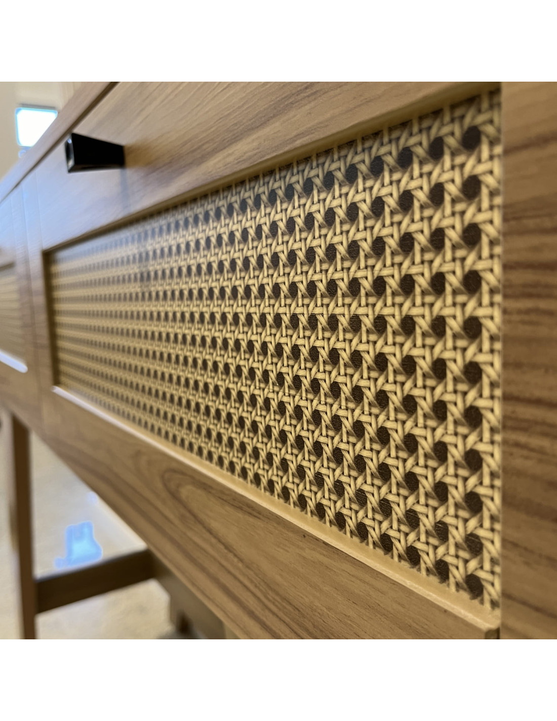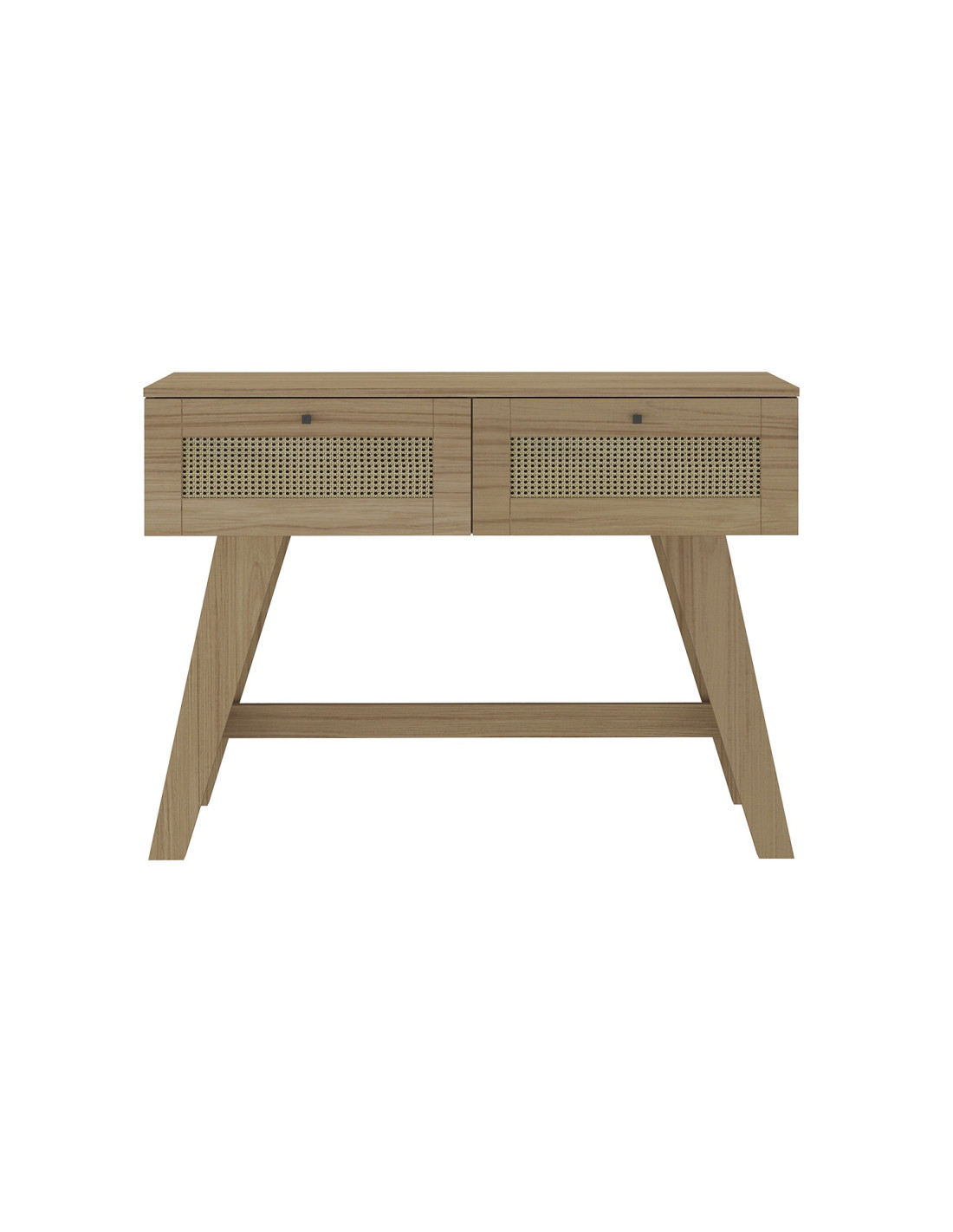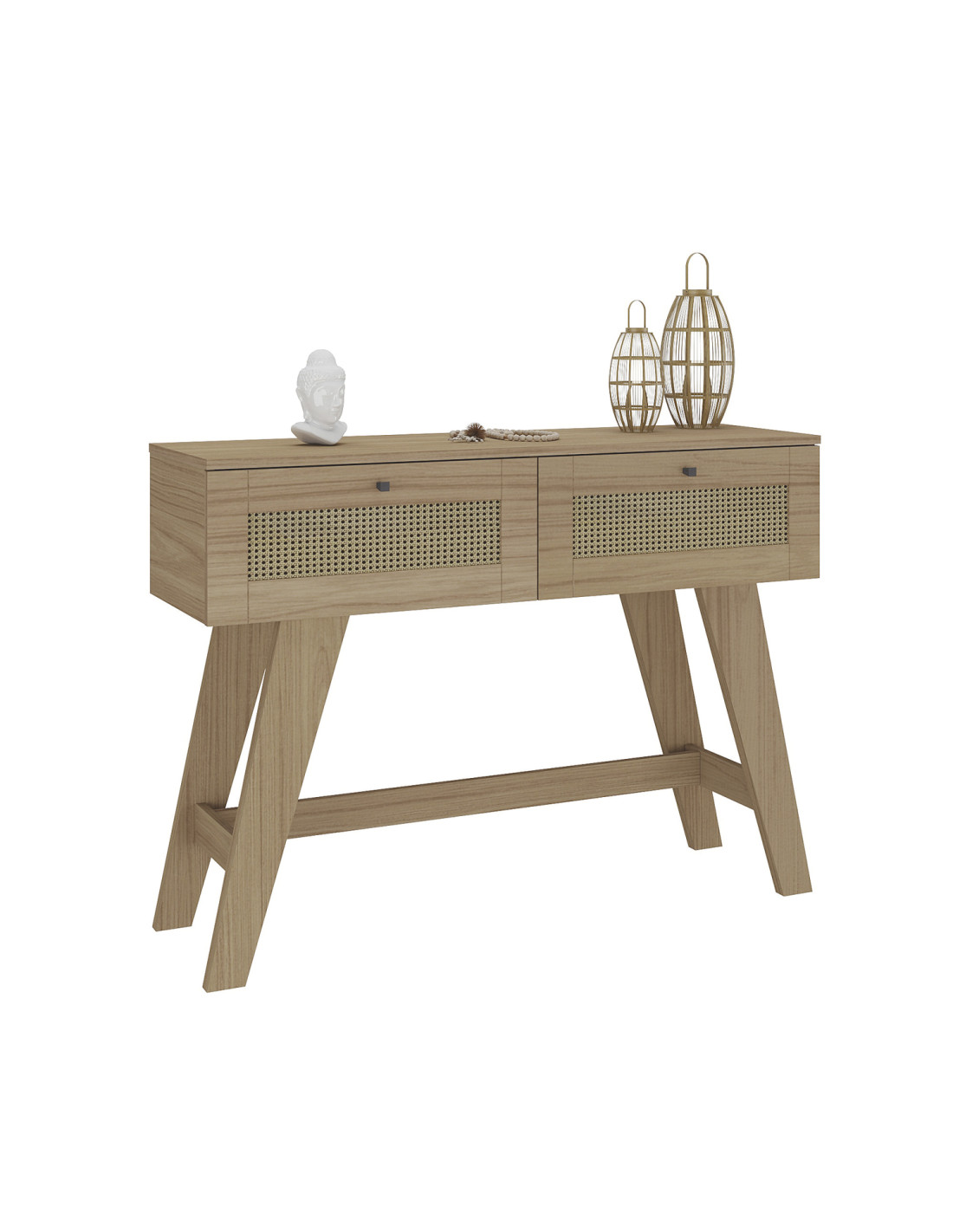 El Arrimo Trama aporta carácter contemporáneo a la entrada o el living. Su diseño geométrico en tono café equilibra calidez y sofisticación, mientras su cubierta recibe lámparas, floreros y arte. Los cajones con riel telescópico brindan un deslizamiento suave para guardar llaves o accesorios, y la pintura 3D con acabado ratán suma textura natural. Fabricado en MDF, este arrimo de recibidor ordena con estilo y realza pasillos y espacios sociales con presencia refinada.