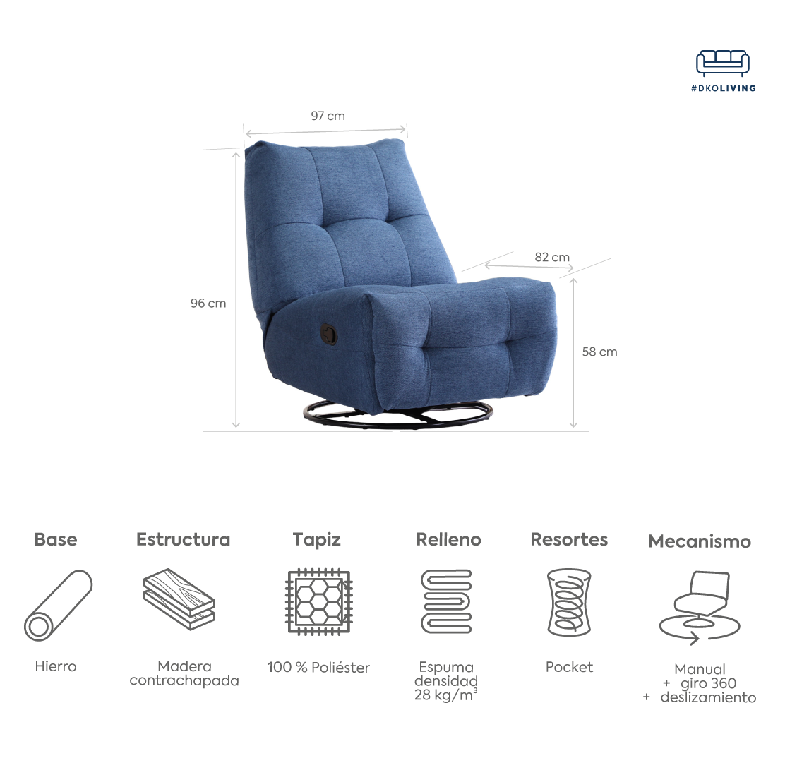 Con estructura de madera contrachapada, relleno de espuma densidad 28 kg/m³, tapiz de tela aterciopelada 100% poliéster y sistema reclinable manual con giro y deslizamiento, ofrece confort y funcionalidad en cada uso.