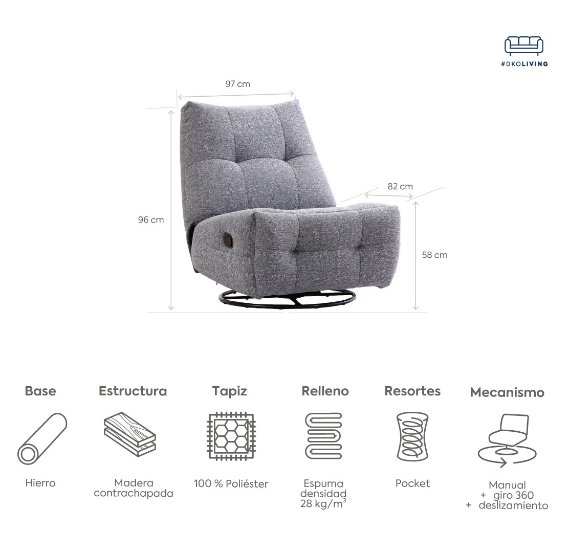 Su estructura de madera contrachapada, relleno de espuma densidad 28 kg/m³, tapiz de tela aterciopelada 100% poliéster y sistema reclinable manual con giro y deslizamiento entregan una combinación ideal de confort, suavidad y practicidad.