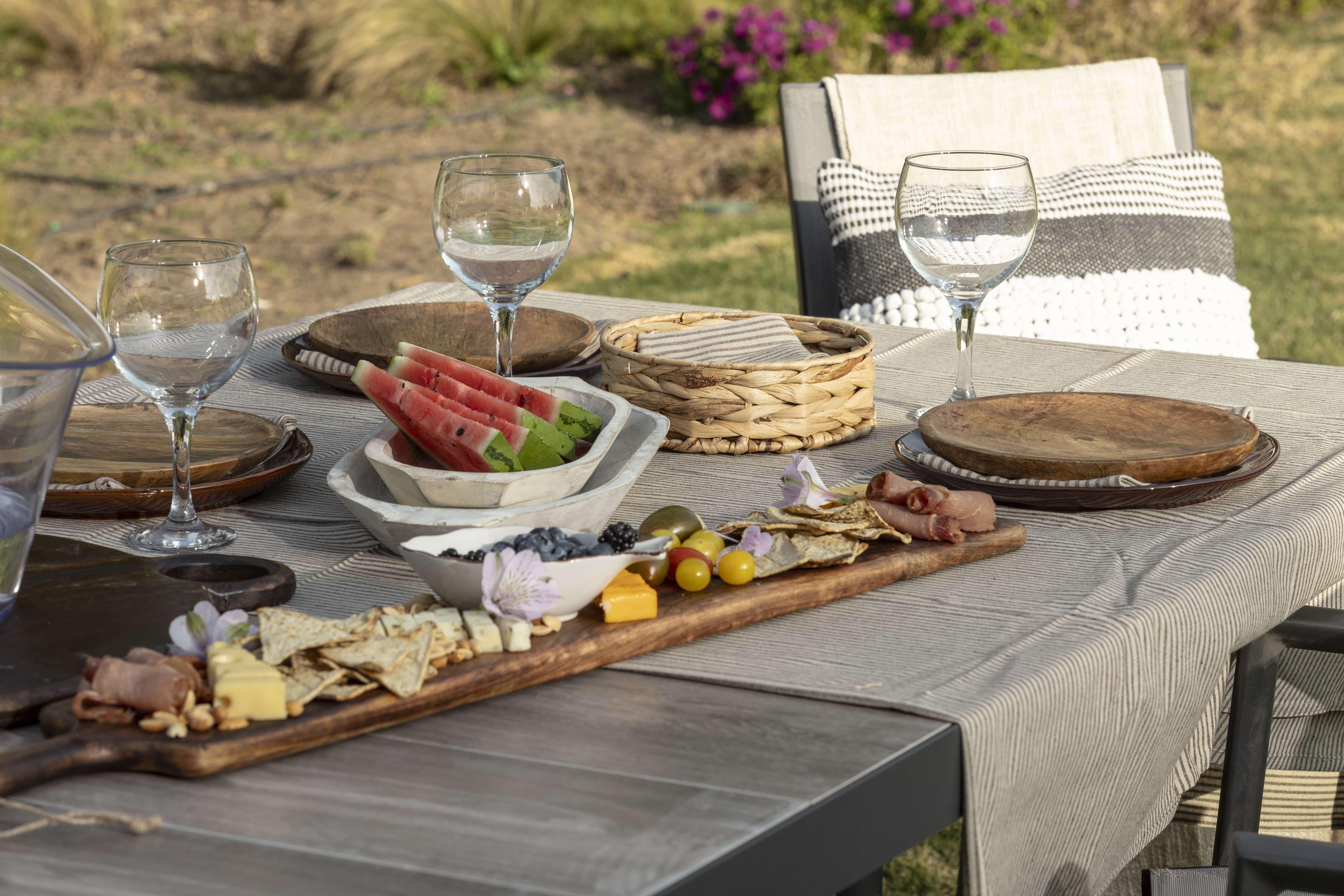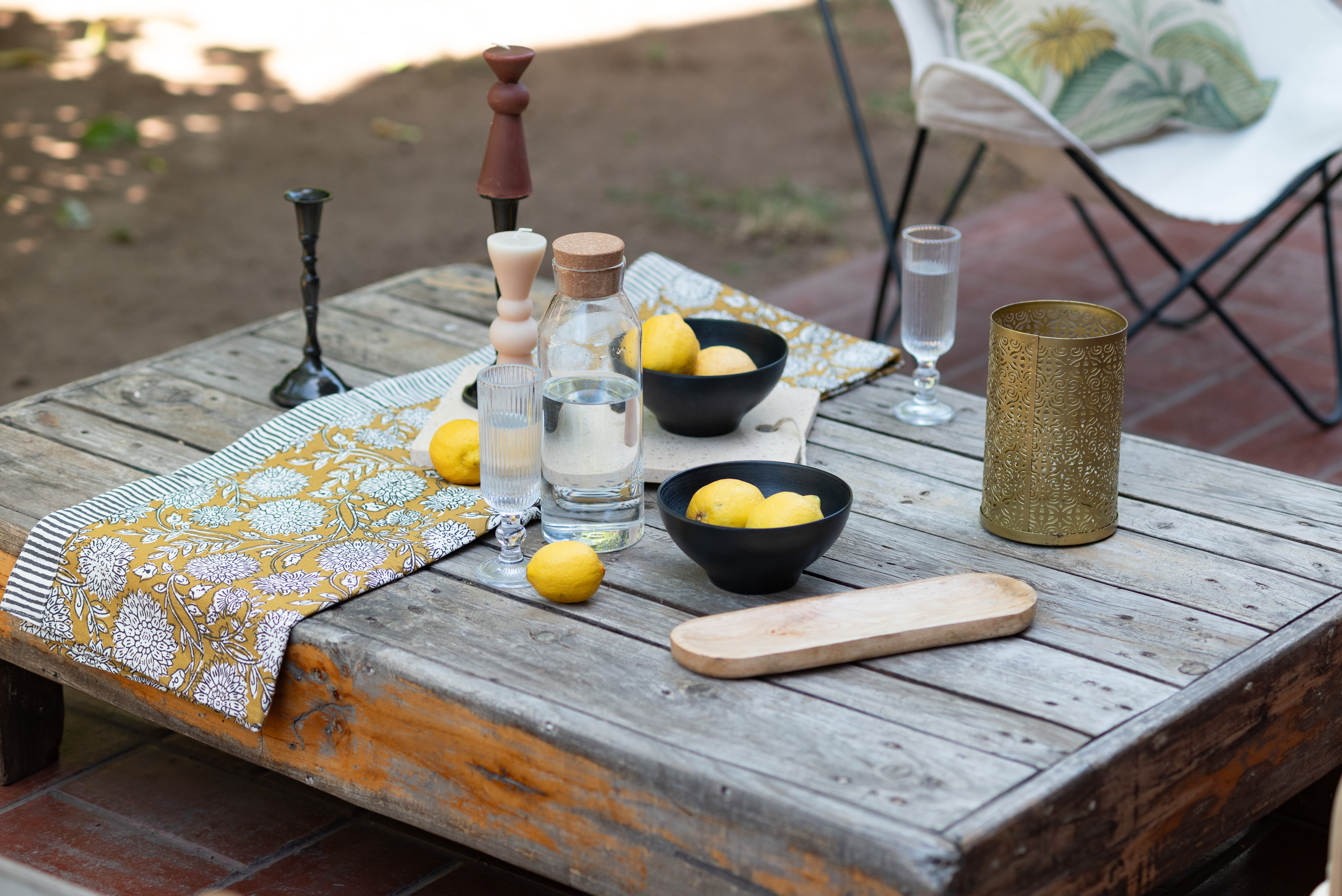 Tip de decoración: Suma un camino de mesa o mantel liviano, bowls de cerámica y elementos simples como frutas o vasos de vidrio. Este tipo de decoración para terrazas se ve natural, cercana y perfecta para el uso diario.