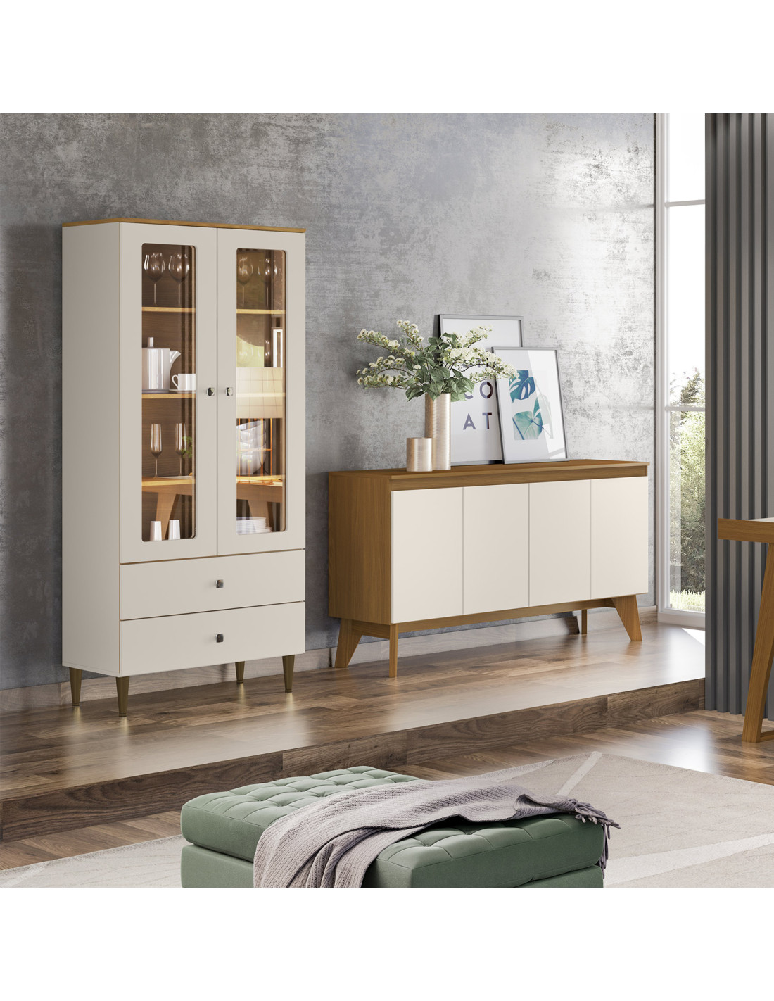 La vitrina Pia combina estilo y funcionalidad en un diseño contemporáneo que realza cualquier espacio del hogar. Sus puertas de vidrio permiten exhibir objetos decorativos con elegancia, mientras los cajones inferiores ofrecen almacenamiento práctico. El acabado cálido y las líneas limpias aportan sofisticación y armonía visual. Ideal para comedores o salas modernas, es una pieza que equilibra diseño, utilidad y belleza.