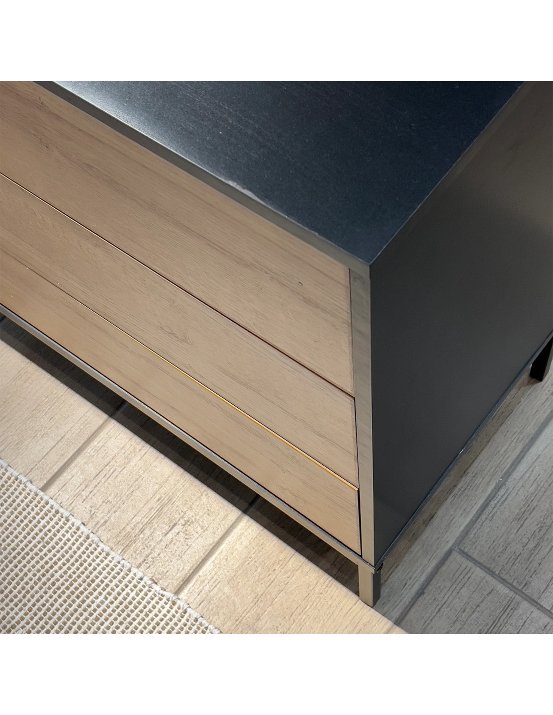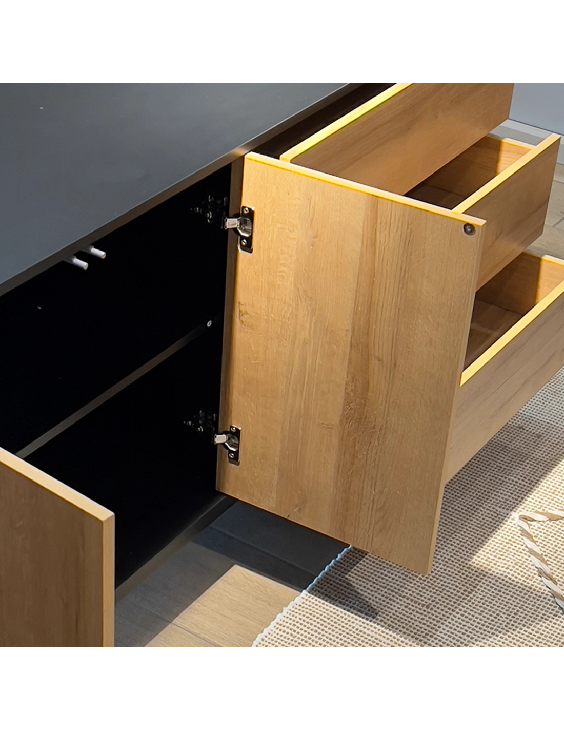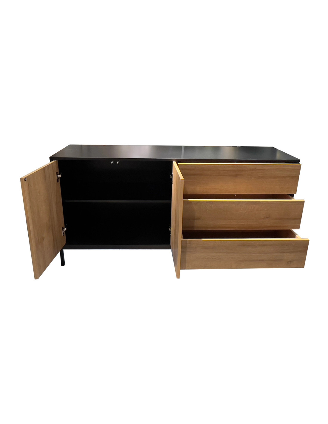 Su estructura en MDP (panel de partículas de densidad media) entrega resistencia y estabilidad, mientras que su diseño en tonos roble y negro aporta carácter y personalidad. Ideal para quienes buscan un buffet con gran capacidad de almacenamiento y estética contemporánea.