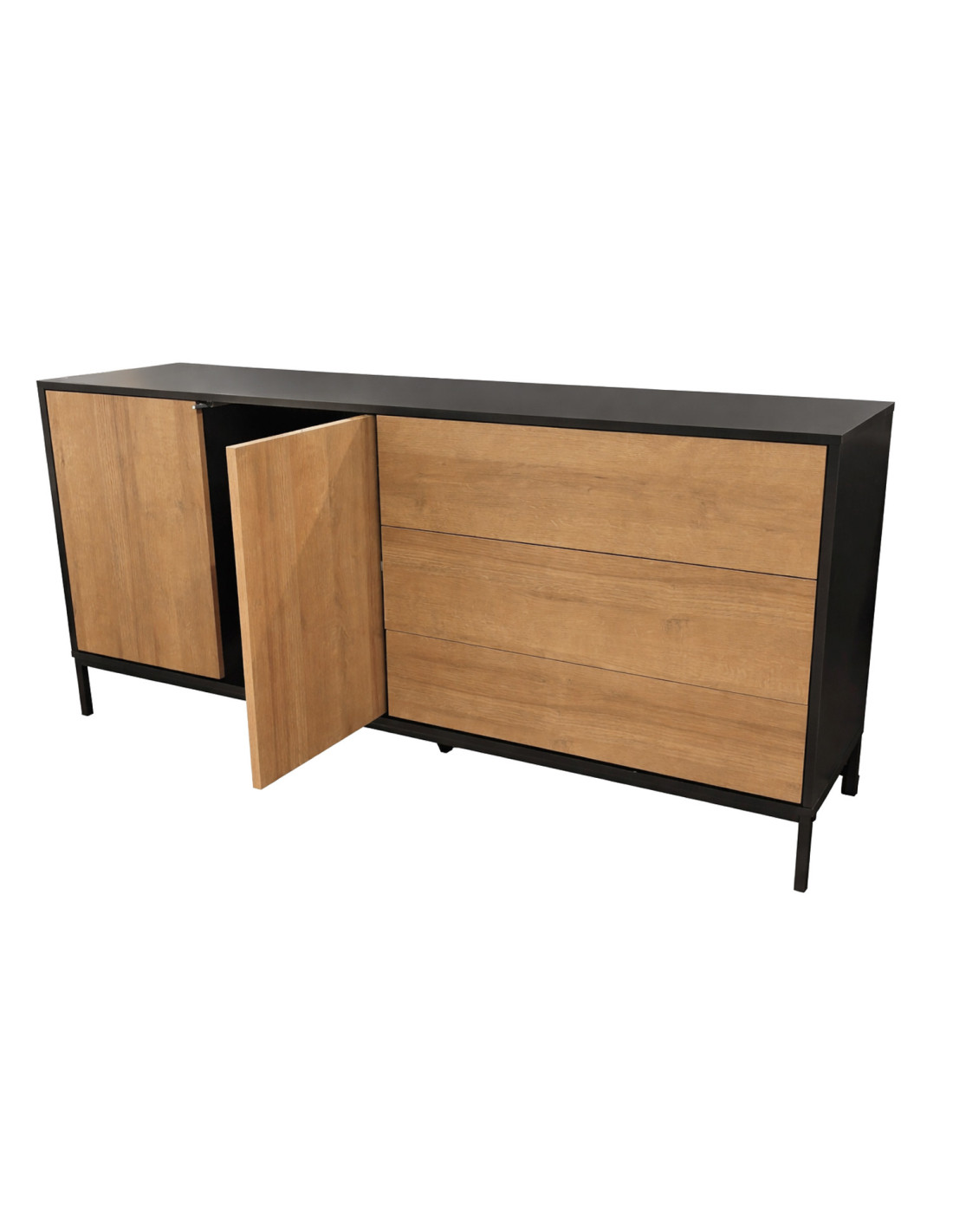Su estructura en MDP (panel de partículas de densidad media) entrega resistencia y estabilidad, mientras que su diseño en tonos roble y negro aporta carácter y personalidad. Ideal para quienes buscan un buffet con gran capacidad de almacenamiento y estética contemporánea.