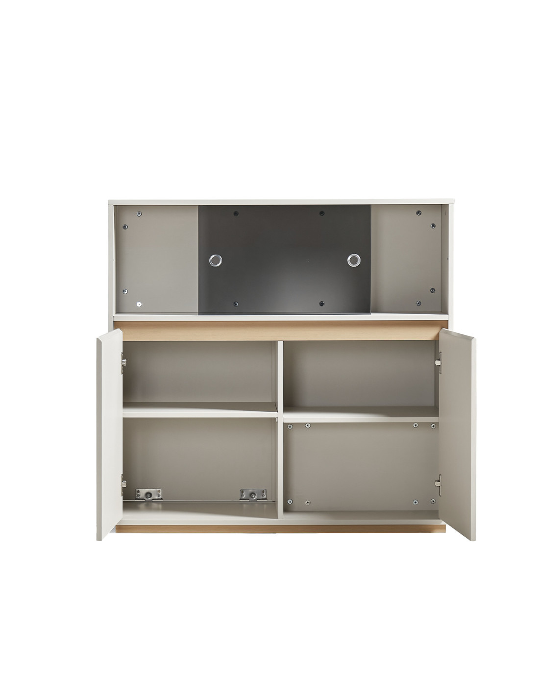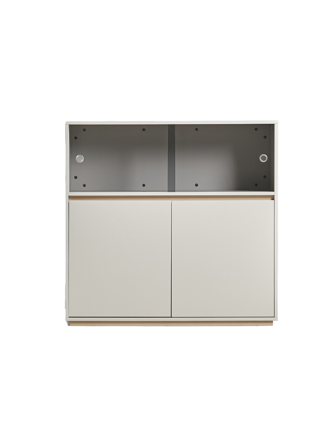 Fabricado con estructura de madera contrachapada, incorpora puertas de vidrio gris que entregan un detalle moderno y distintivo, además de tiradores redondos de aluminio que refuerzan su estética funcional. Su combinación de compartimentos abiertos y cerrados permite mantener todo mejor organizado, uniendo practicidad y diseño en un solo mueble.