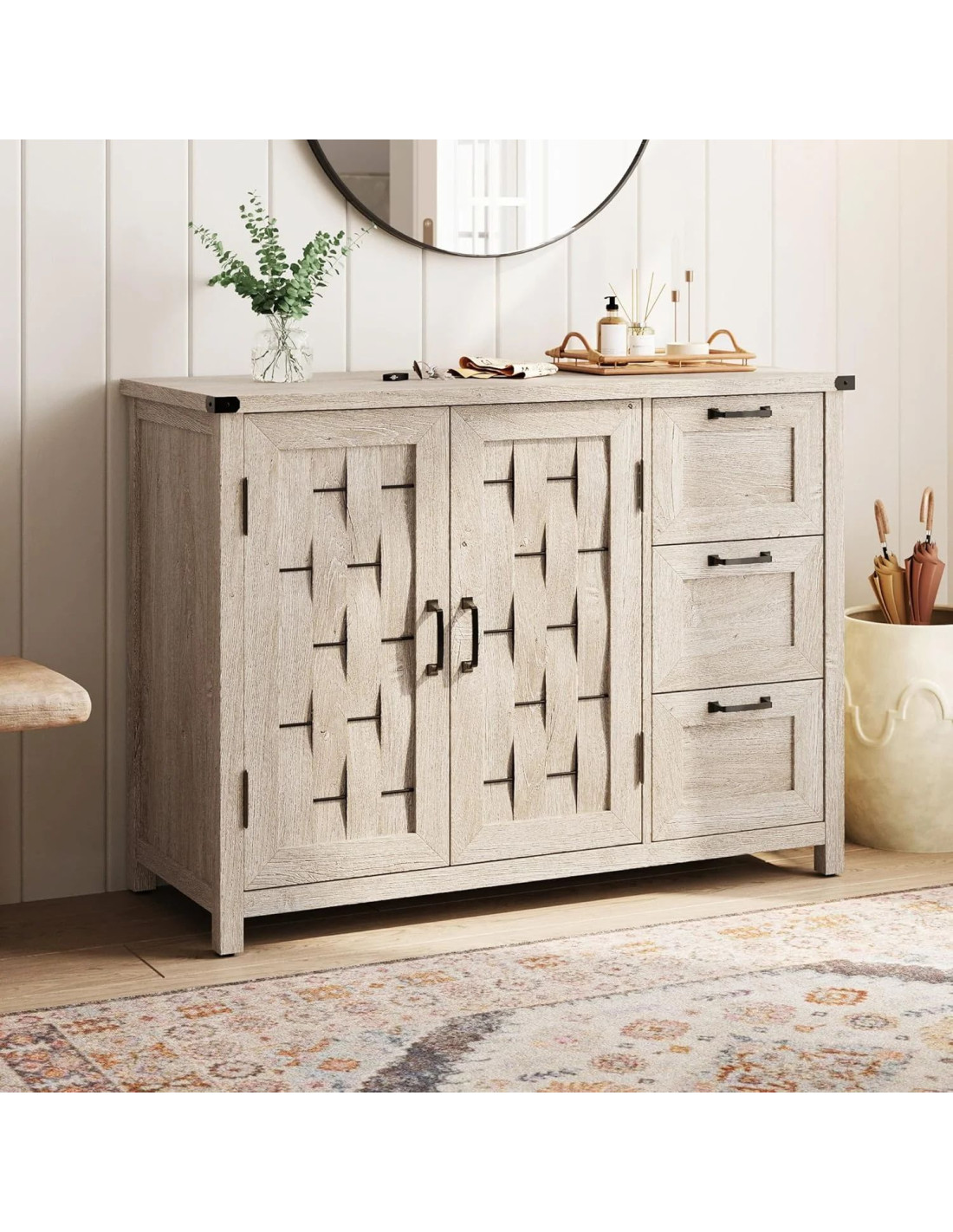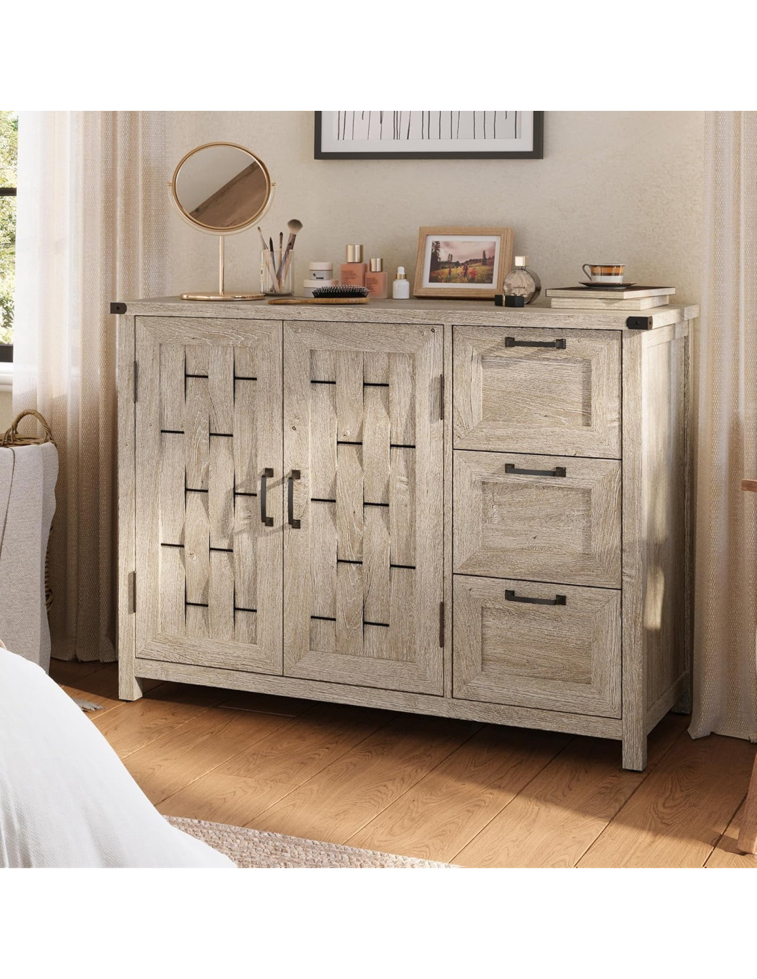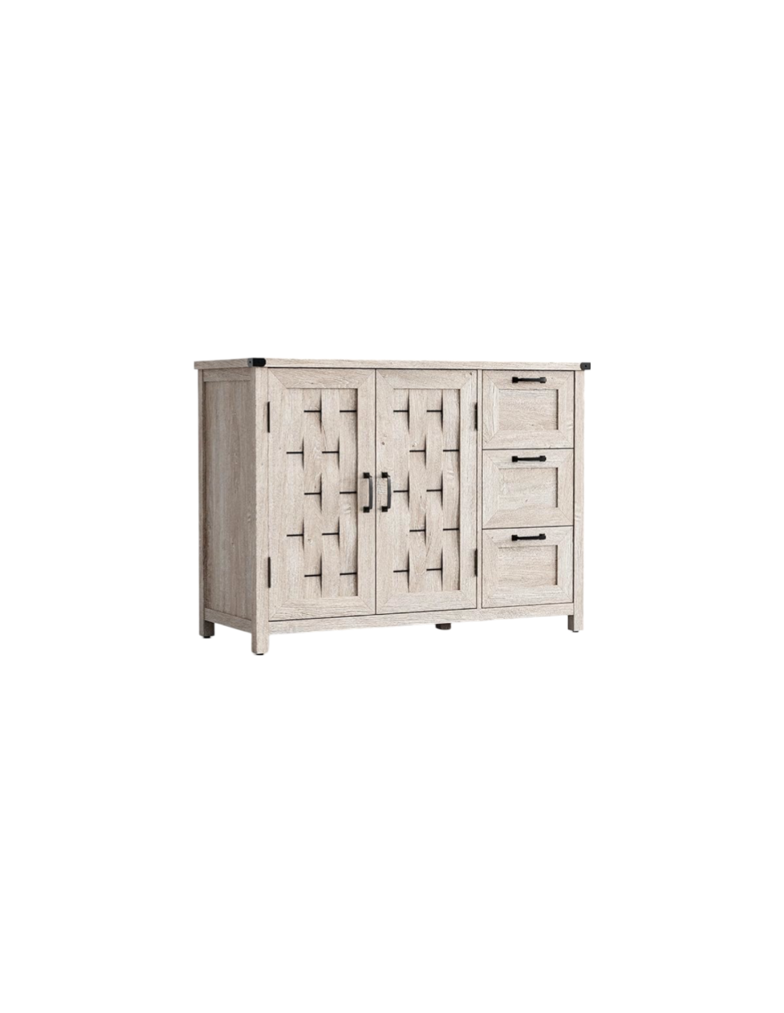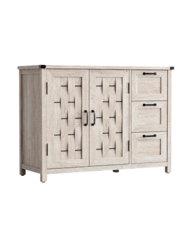 El Buffet Vinh gris de 2 puertas y 3 cajones combina a la perfección estilo y funcionalidad, transformando tu hogar con su encantador diseño rústico. Los distintivos patrones entrelazados y el acabado en madera con vetas naturales, junto con los detalles metálicos, añaden un toque de carácter único a cualquier espacio. Fabricado con tablero de partículas clase P2 y MDF laminado, garantiza una estabilidad sobresaliente, mientras que su amplio espacio de almacenamiento mantiene tus objetos esenciales organizados con elegancia y practicidad.