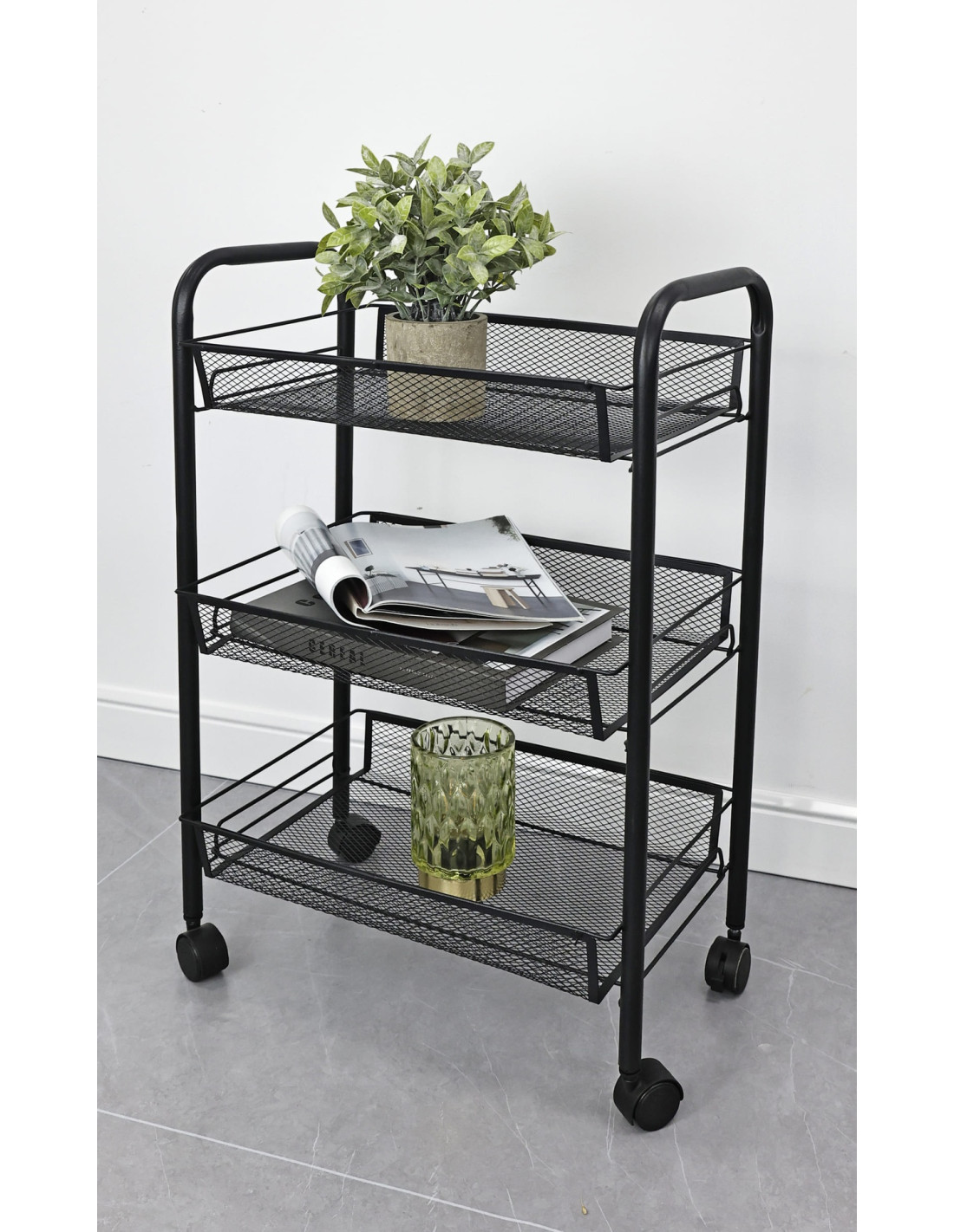 El carro Karen ofrece tres niveles de organización en un diseño moderno y funcional. Ideal para mantener el orden con estilo en cualquier rincón del hogar.