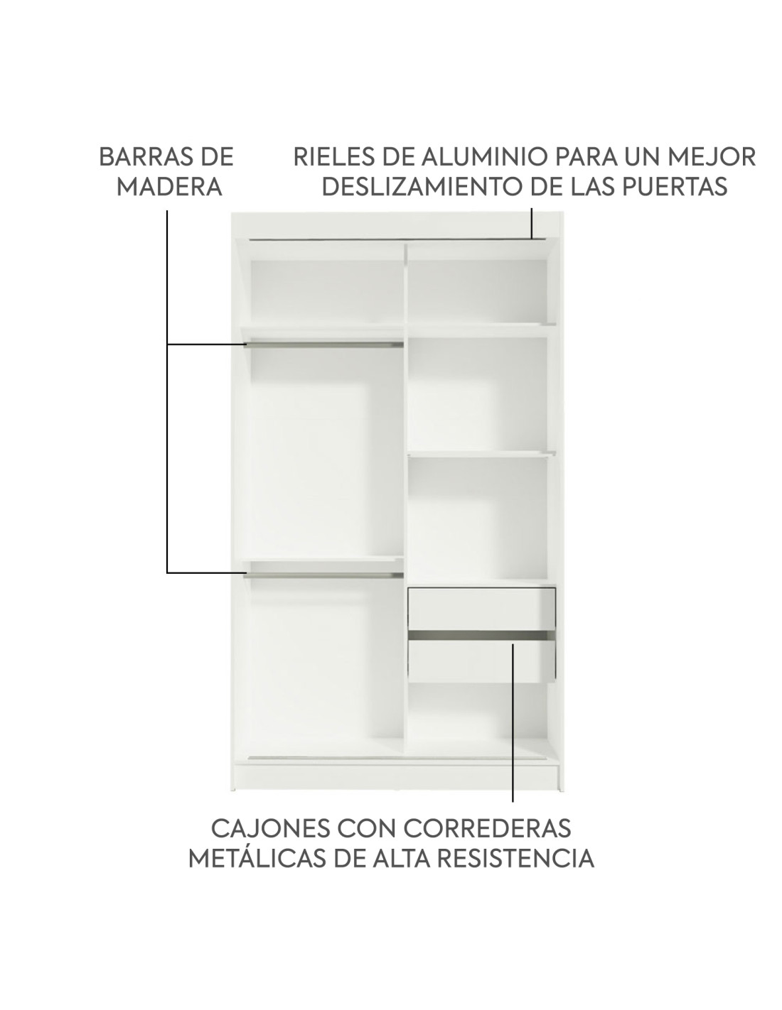 El Closet Tokio de Madesa es la solución perfecta para quienes buscan maximizar el espacio en un dormitorio individual sin sacrificar estilo ni funcionalidad. Con un diseño moderno y elegante, sus dos puertas correderas de suave funcionamiento y tiradores de aluminio aportan un toque sofisticado. Sus interiores incluyen dos cajones con guías metálicas, múltiples estantes y nichos, así como perchas de madera que permiten organizar tanto ropa larga como corta. Su mayor profundidad ofrece un amplio espacio de almacenamiento, manteniendo tu habitación ordenada y llena de frescura.