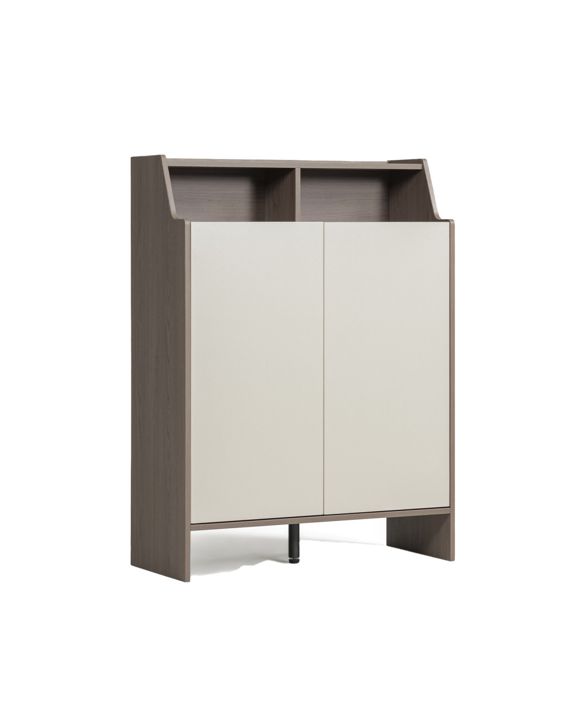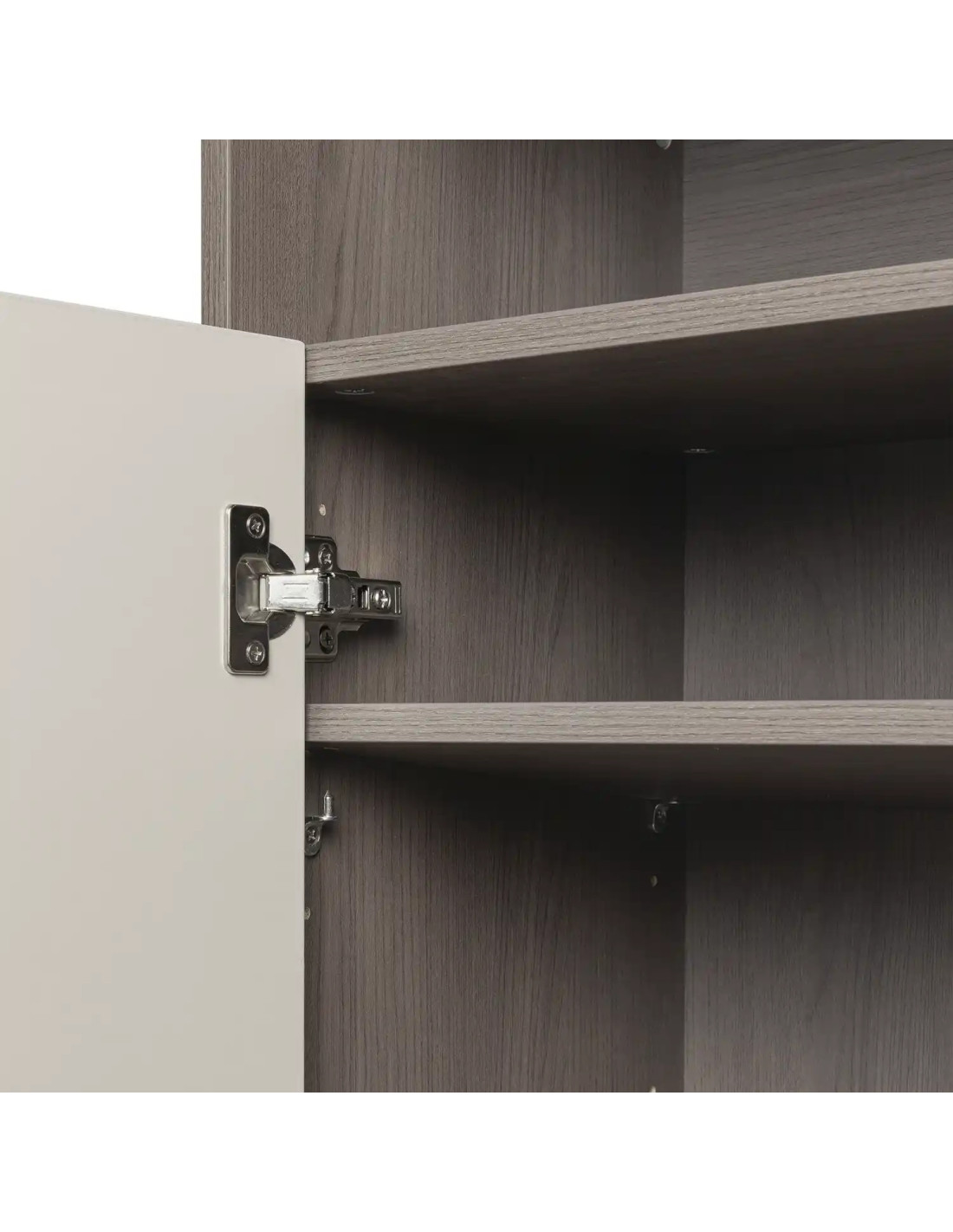 Fabricado con estructura de madera contrachapada y respaldo en fibra de madera, cuenta con puertas, repisas fijas y repisas móviles que ayudan a adaptarse a distintas necesidades de almacenamiento. Además, incorpora bisagras metálicas que favorecen un uso firme y funcional en el día a día.