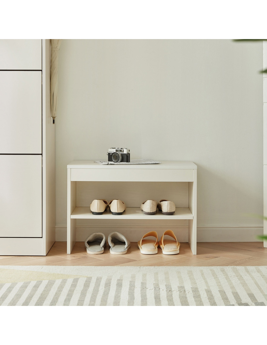 Luminoso y funcional, el zapatero Adila combina blanco y madera para un look limpio y natural.