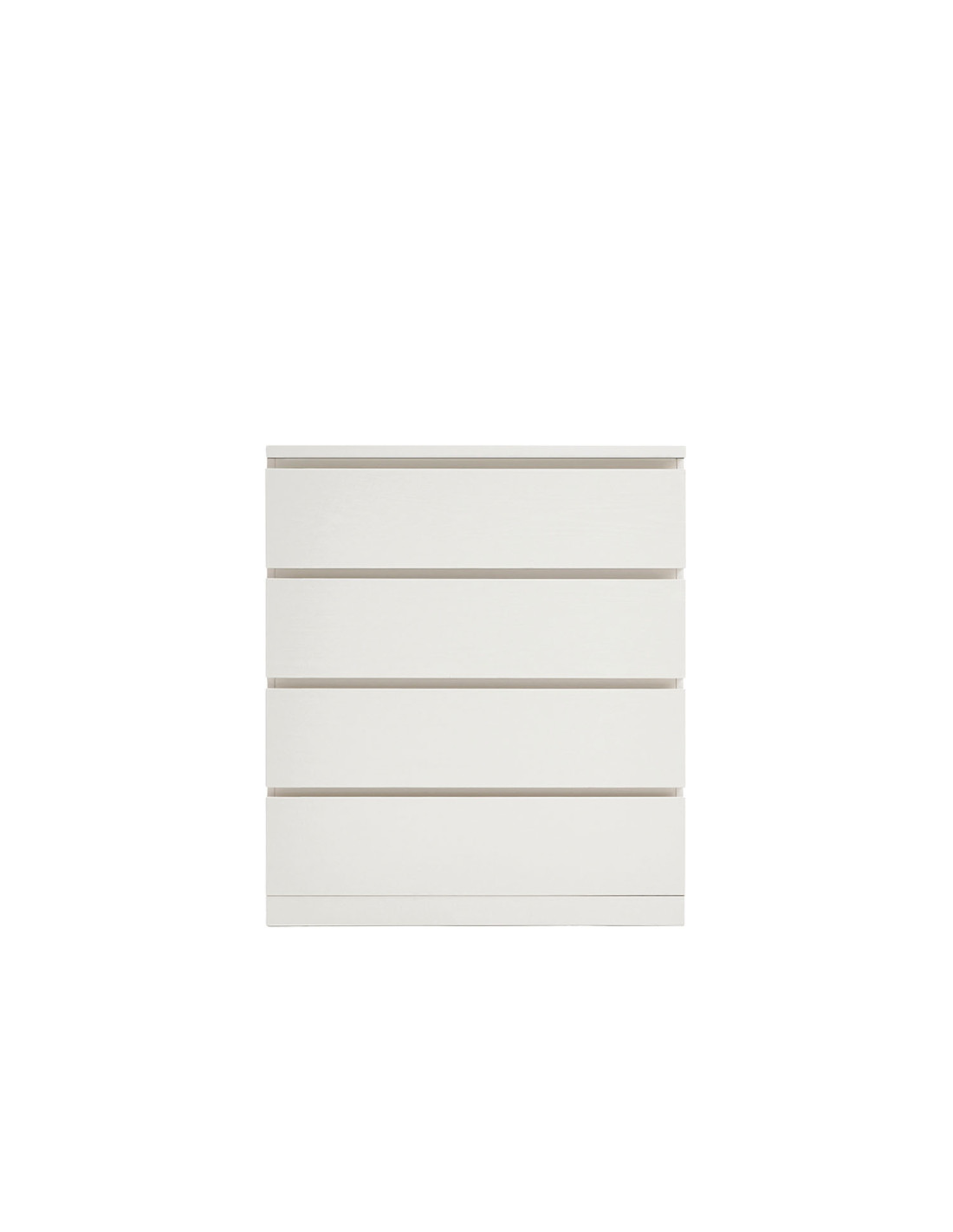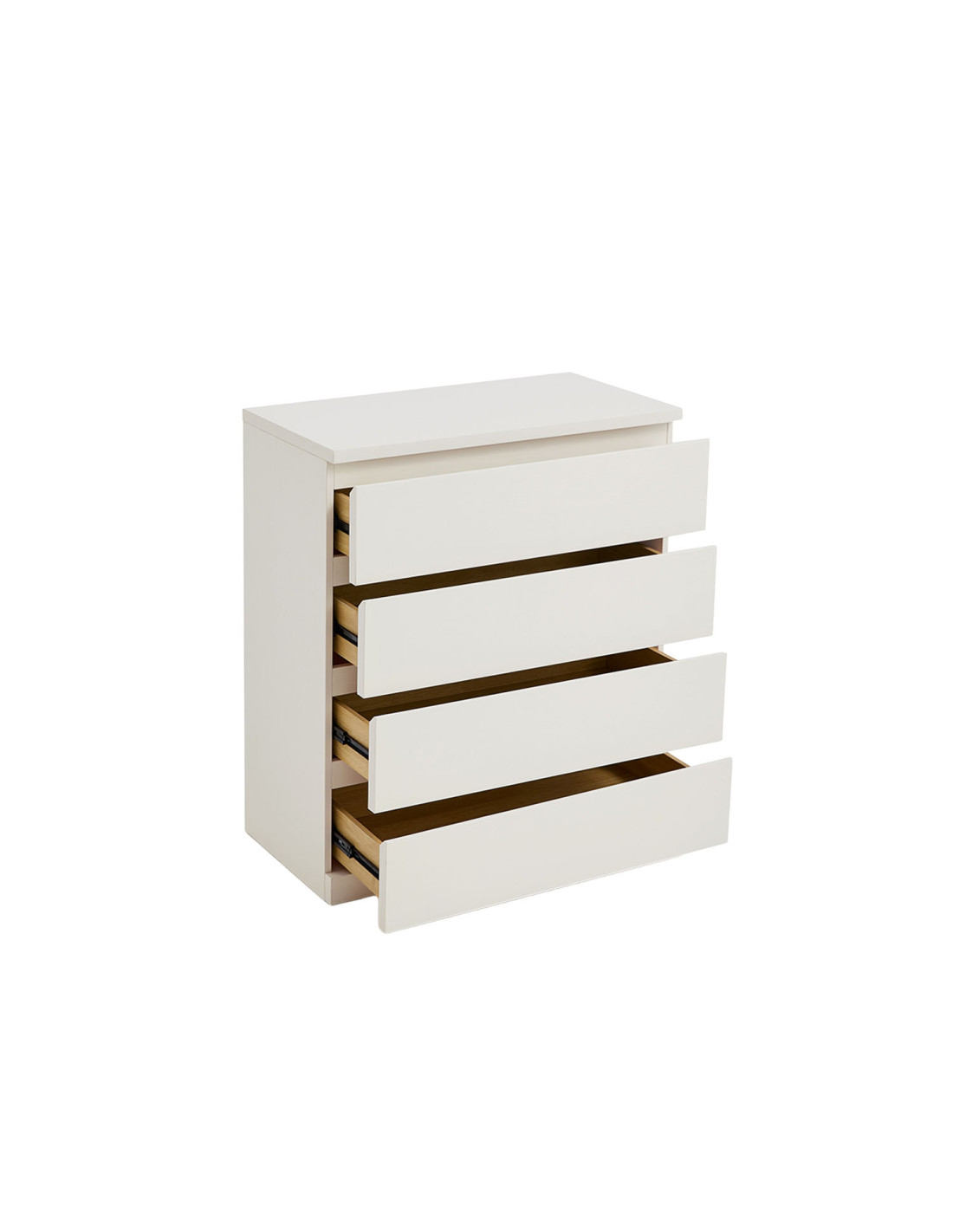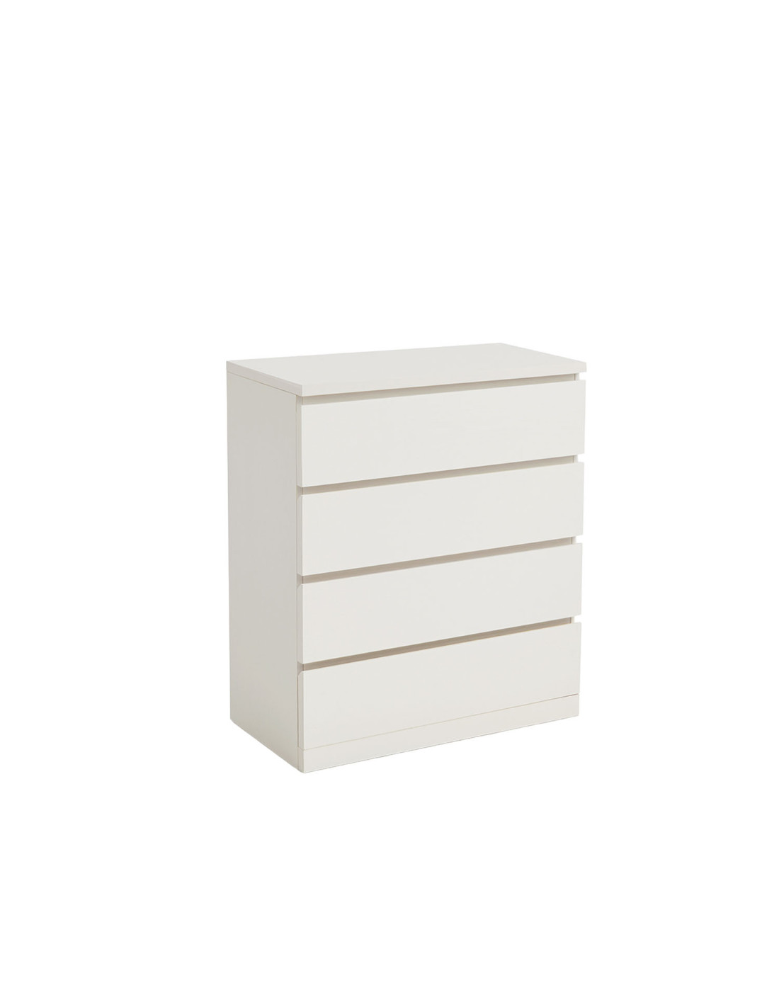 Cómoda Kaia blanca de 4 cajones con estructura de madera de caucho. Mueble moderno y funcional, ideal para dormitorio, living u oficina, con amplio espacio de almacenamiento y diseño versátil.
