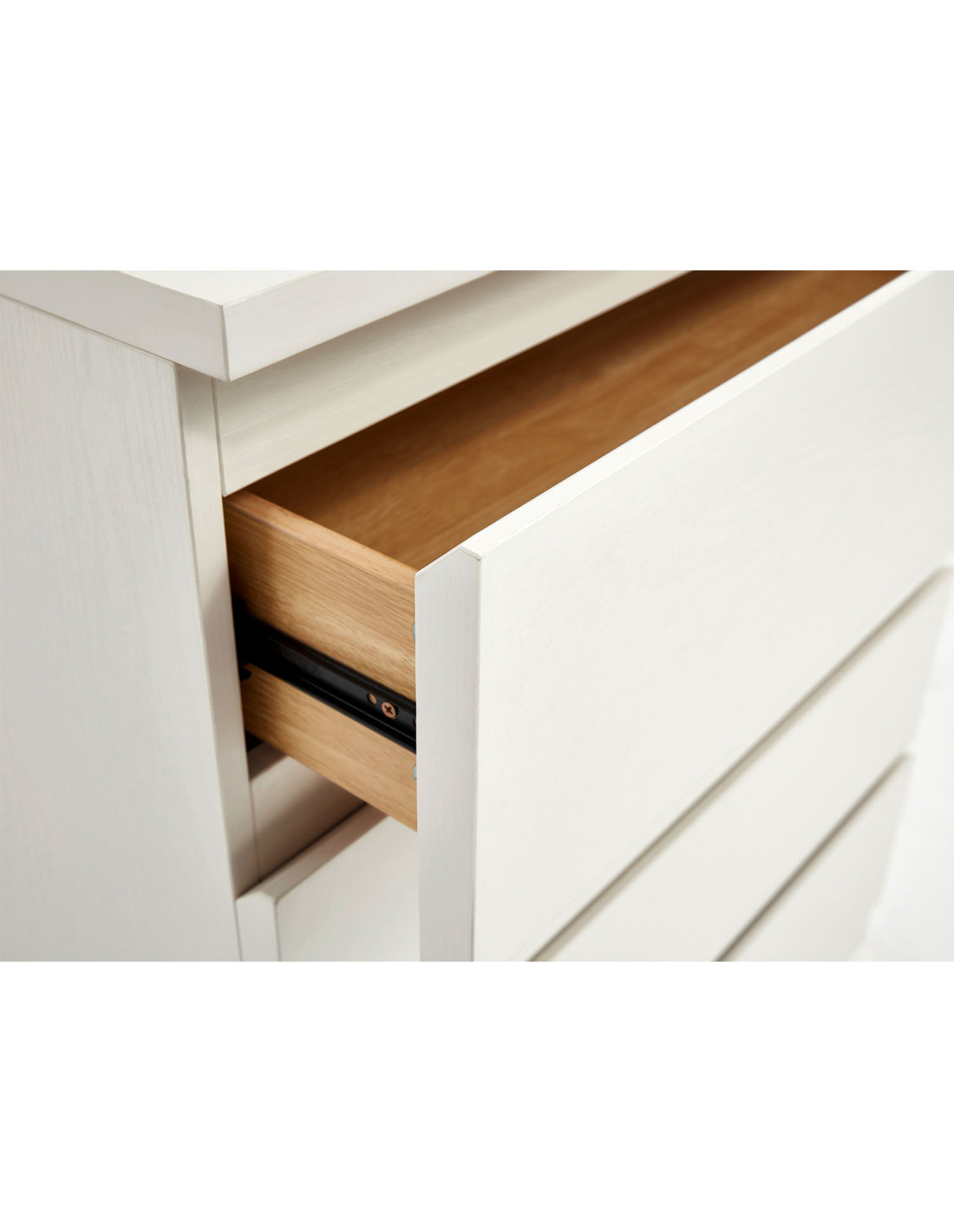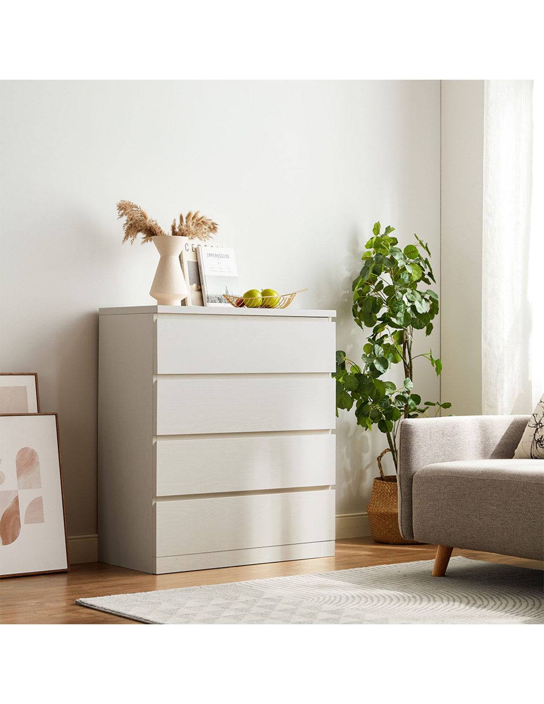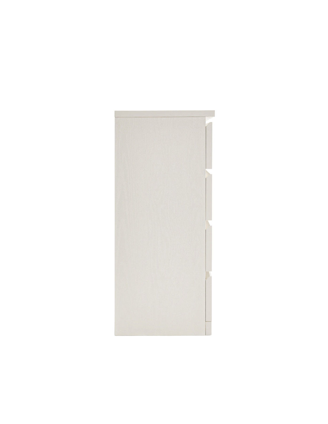 Cómoda Kaia blanca de 4 cajones con estructura de madera de caucho. Mueble moderno y funcional, ideal para dormitorio, living u oficina, con amplio espacio de almacenamiento y diseño versátil.