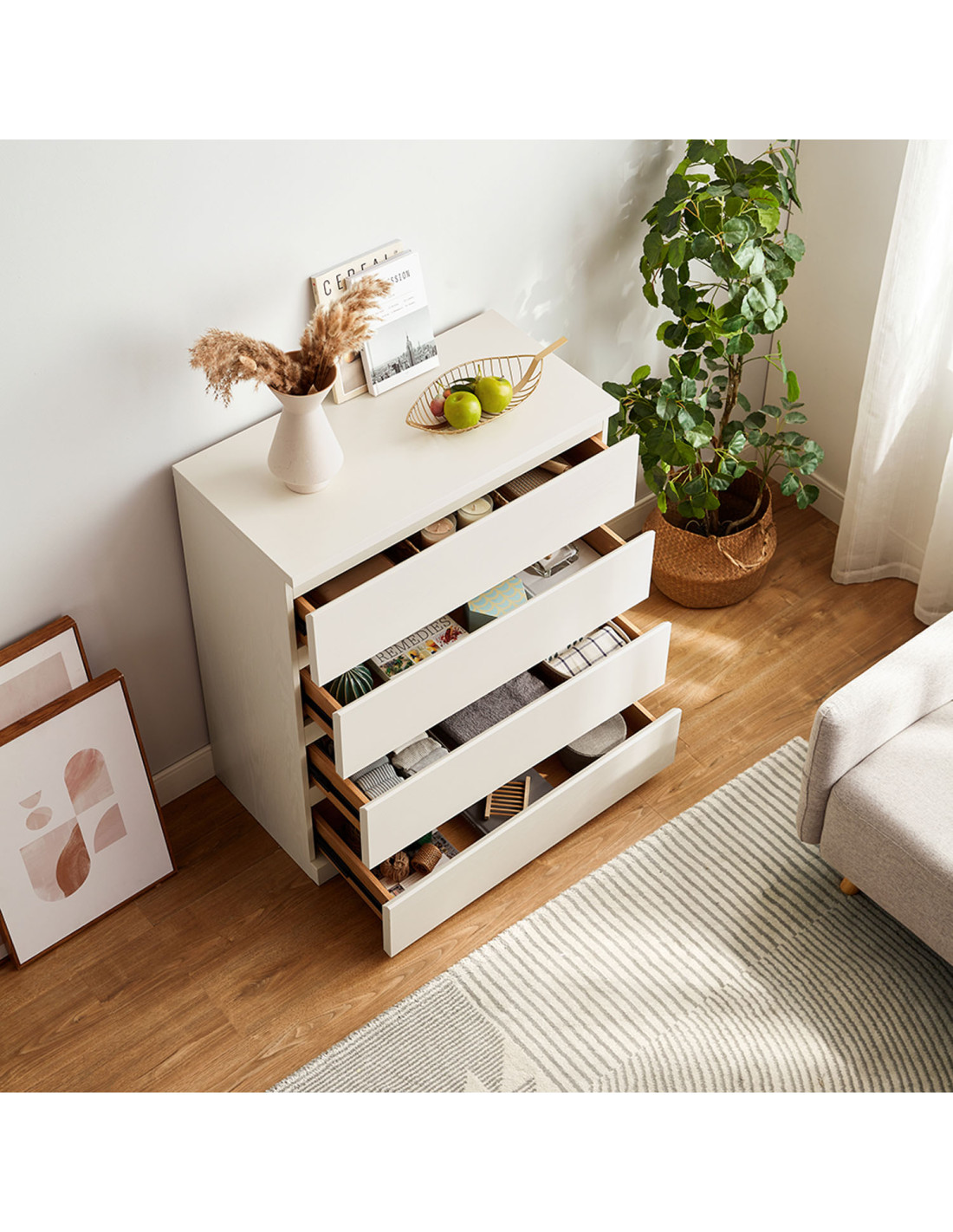 Fabricada con estructura sólida de madera de caucho, esta cómoda ofrece estabilidad y durabilidad para el uso diario. Sus cuatro cajones amplios con rieles telescópicos permiten organizar ropa, accesorios o documentos de manera cómoda y eficiente, manteniendo todo en su lugar.