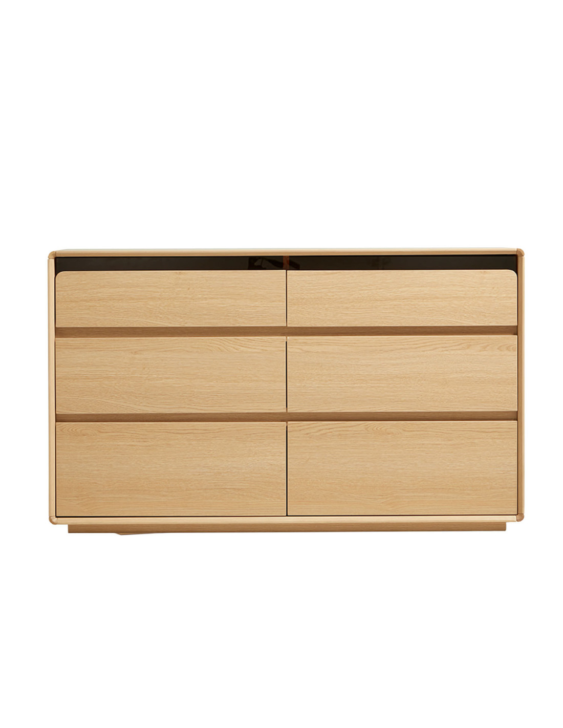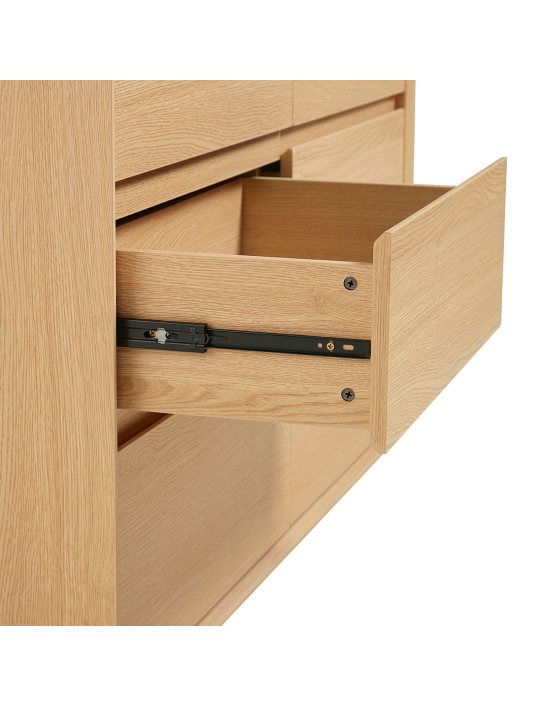 Cómoda de 6 cajones fabricada en MDF con melamina, equipada con rieles telescópicos y tiradores de perfil biselado. Diseño funcional y versátil para distintos espacios del hogar.