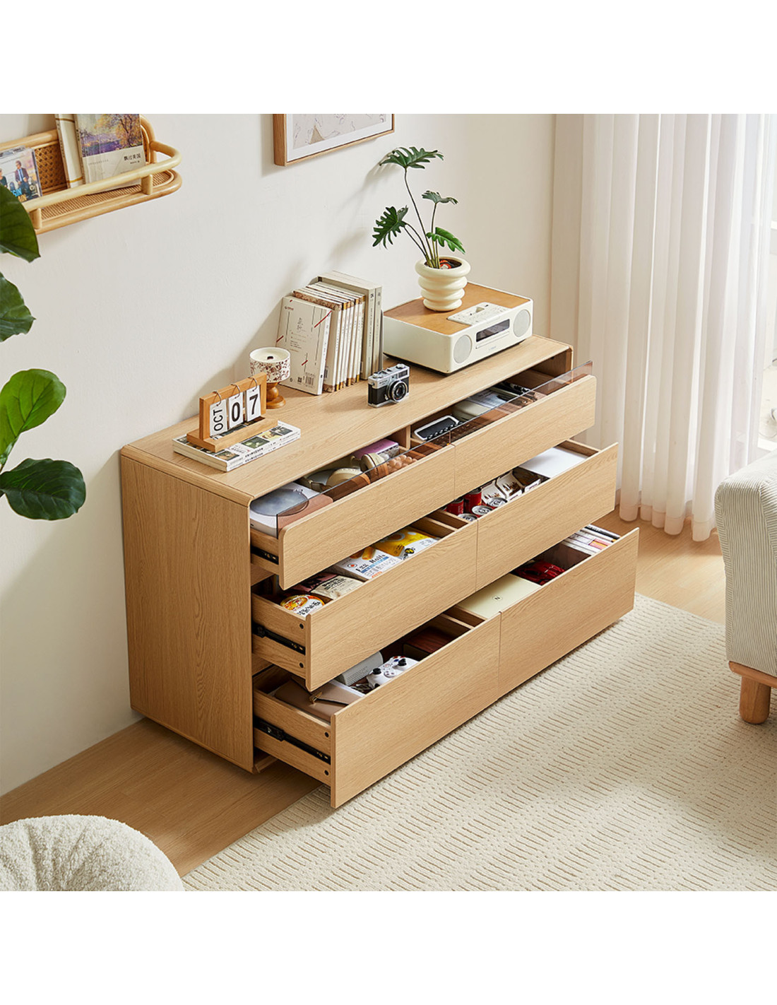 Fabricada en MDF con melamina, cuenta con 6 cajones con rieles telescópicos y tiradores de perfil biselado, que facilitan una apertura suave y cómoda. Ideal para organizar ropa, accesorios u objetos esenciales, esta cómoda destaca por su versatilidad y diseño práctico.