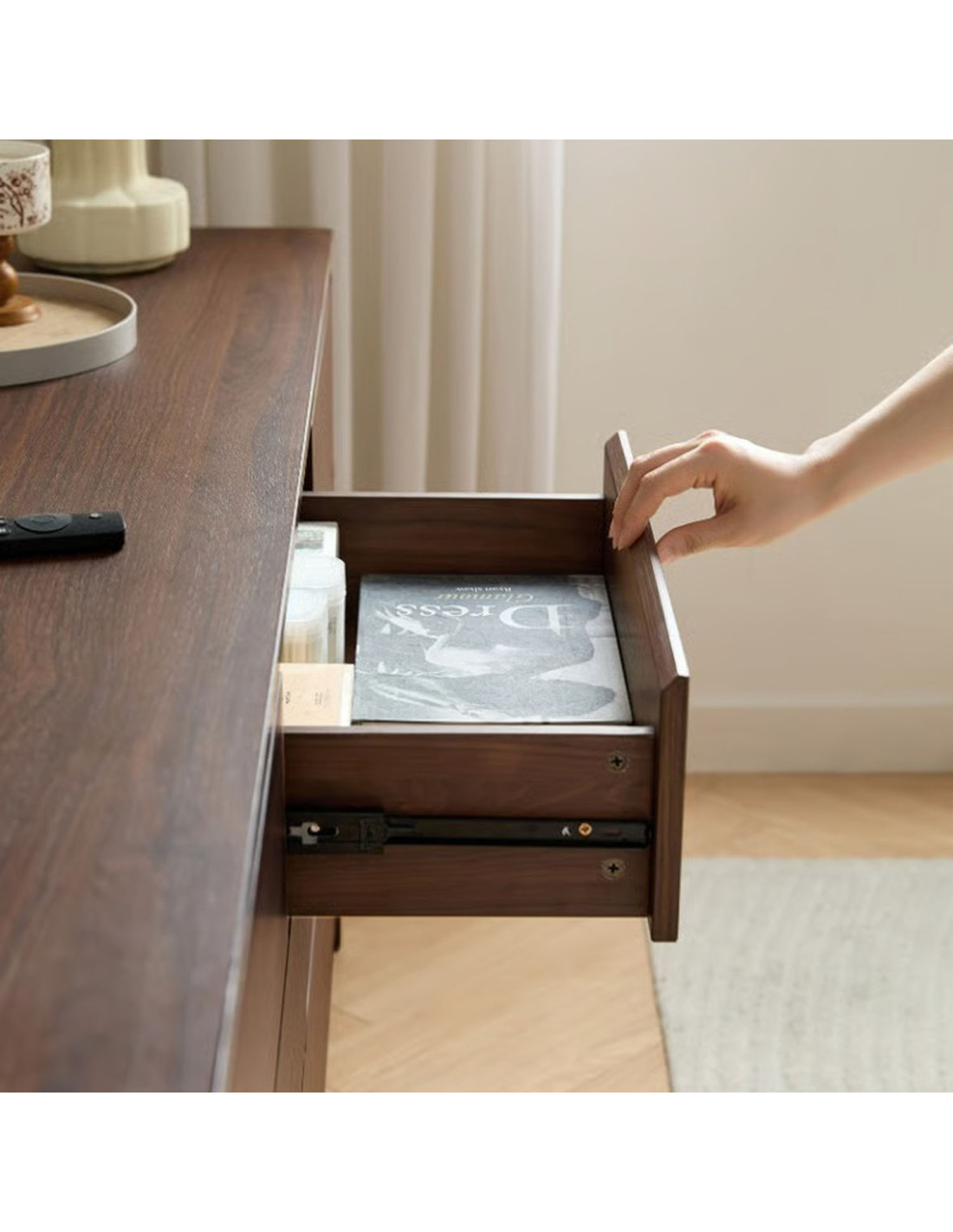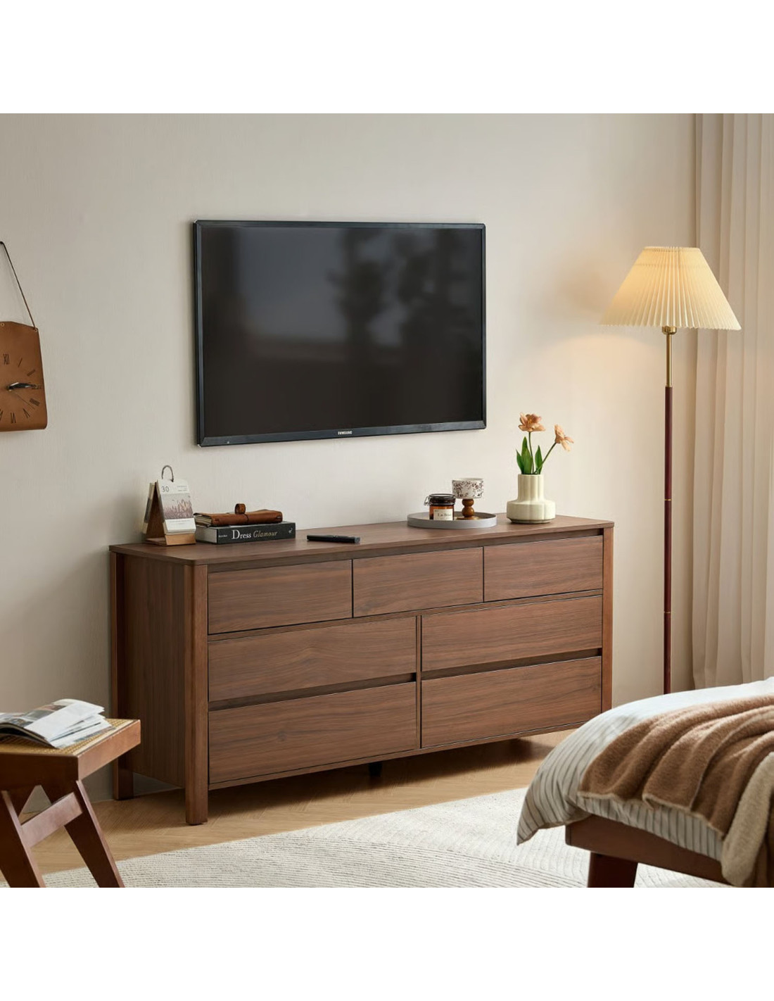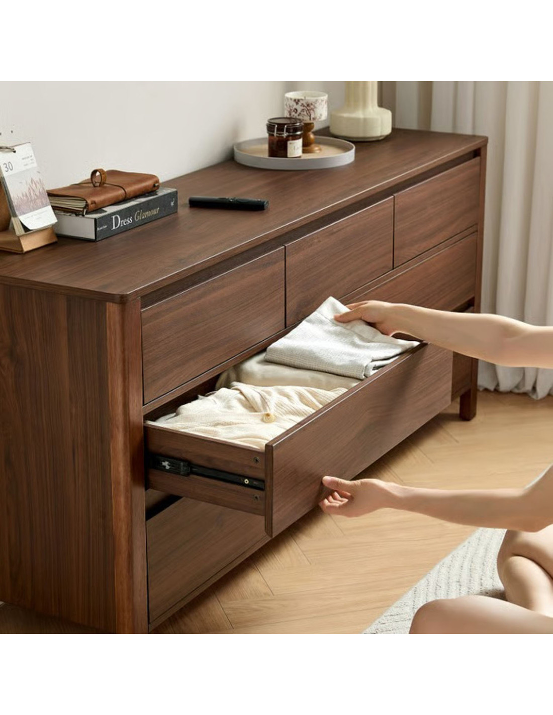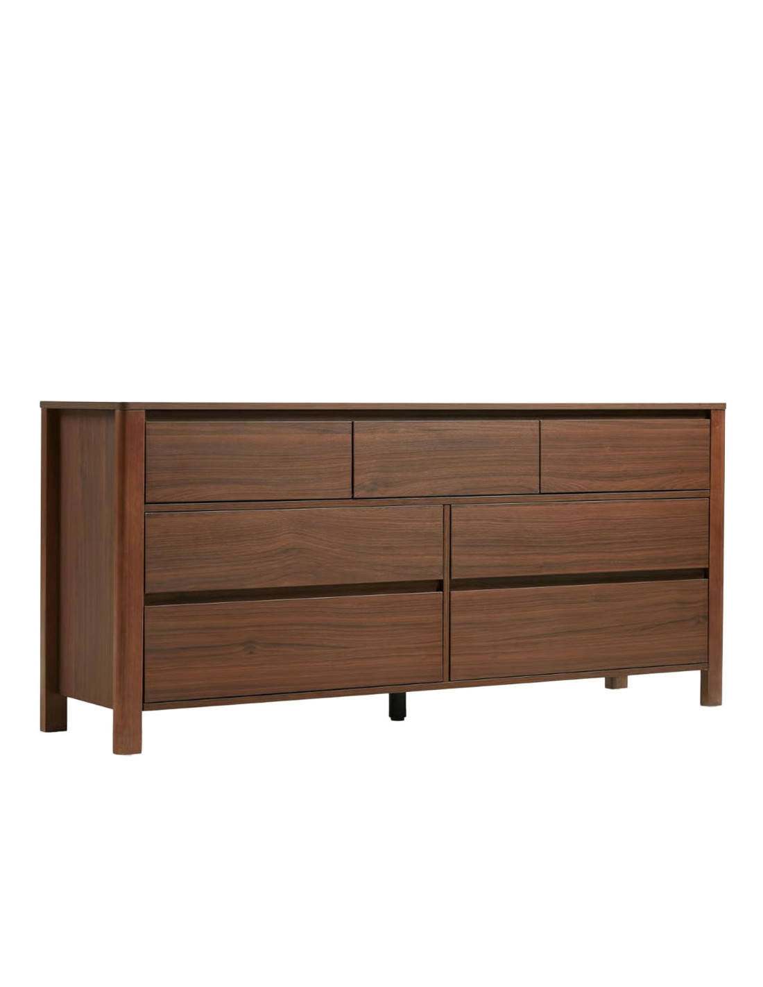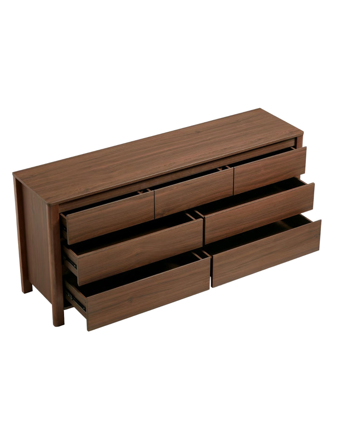 Fabricada con estructura de madera de caucho, ofrece resistencia y durabilidad para el uso diario. Cuenta con 7 cajones con rieles telescópicos, que permiten una apertura suave y silenciosa. Además, sus tiradores embutidos mantienen una estética limpia y segura, ideal para un uso práctico y cómodo en el día a día.