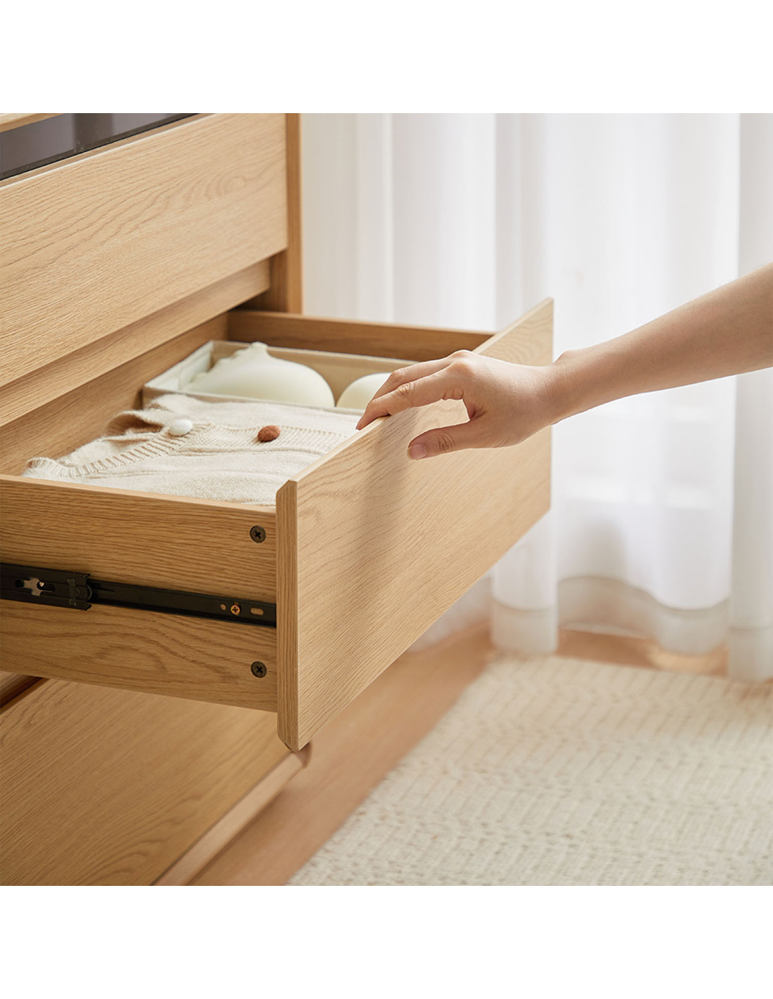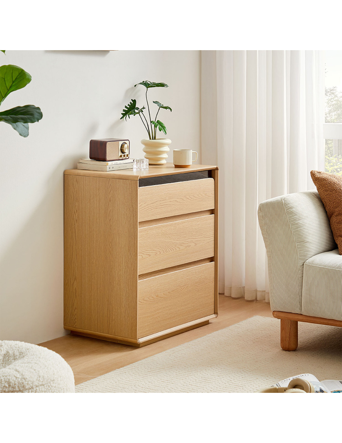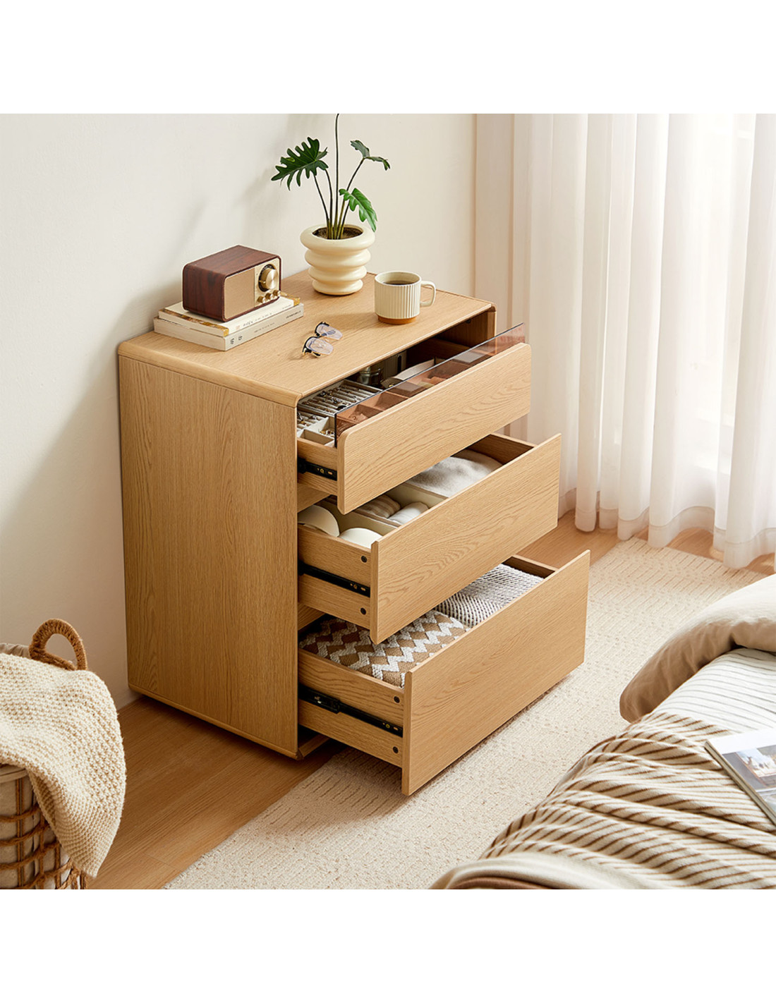 Los tres cajones amplios ofrecen un espacio ideal para guardar ropa, accesorios o artículos personales, manteniendo tu entorno ordenado y libre de desorden. Su estructura sólida y acabado cuidado garantizan durabilidad y presencia, convirtiendo a la Selka en una pieza central que no sólo organiza, sino que también realza el estilo de tu habitación.