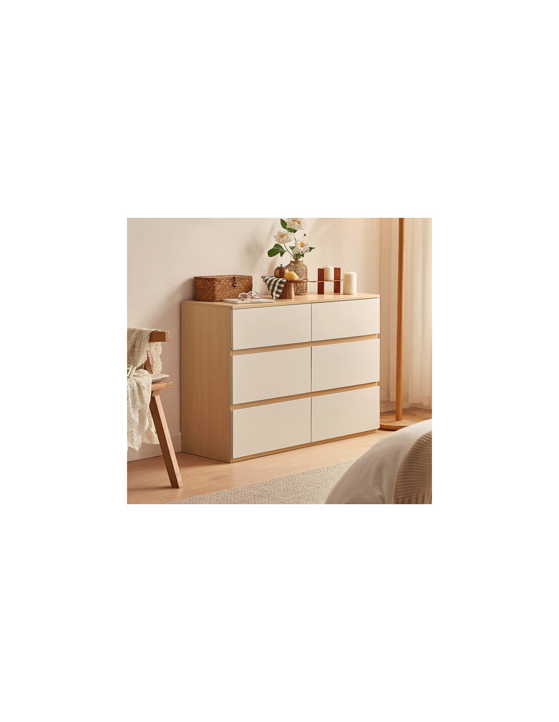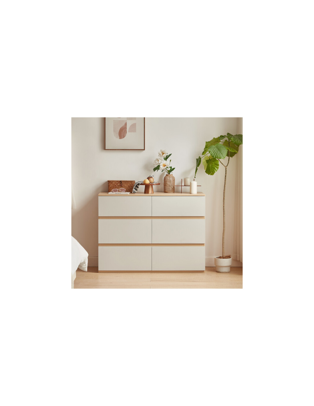 La cómoda 6 cajones Belem combina diseño funcional y elegancia para ofrecer un espacio de almacenamiento organizado y sofisticado. Sus seis amplios cajones permiten mantener tus pertenencias en orden y protegidas del polvo, mientras que su superficie espaciosa facilita el acceso a objetos de uso diario. El sistema de deslizamiento garantiza una apertura suave y sin esfuerzo, y su estructura resistente con patas de apoyo brinda estabilidad y durabilidad. Su diseño con tiradores integrados aporta un estilo limpio y moderno, ideal para complementar cualquier ambiente con un toque de armonía y practicidad.