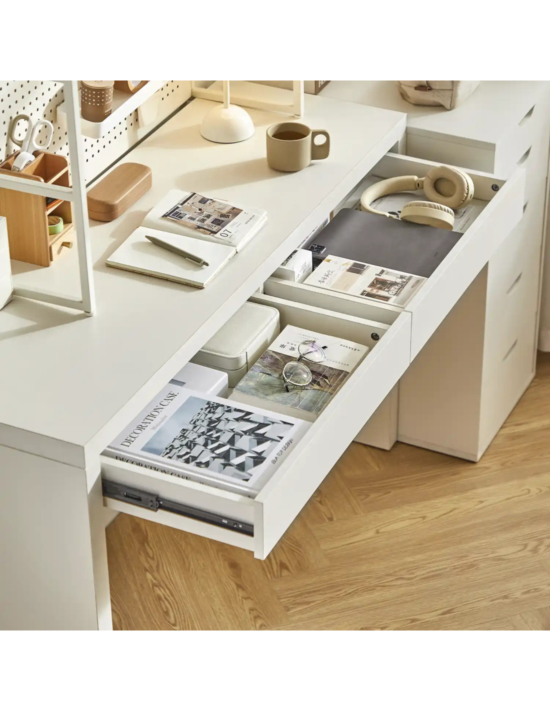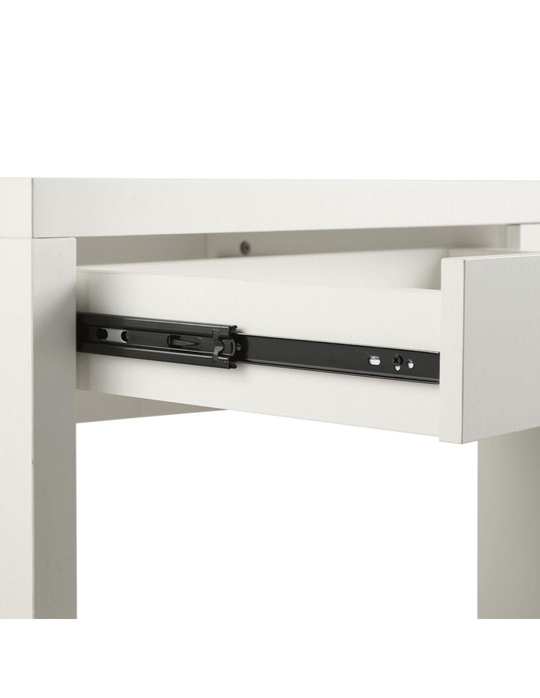 Escritorio con 2 cajones y rieles metálicos, ideal para organizar y complementar tu espacio de trabajo con estilo y funcionalidad.