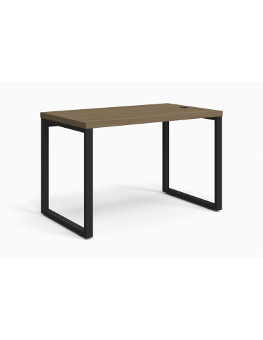 Escritorio industrial con estructura metálica y superficie de madera café, resistente y con estilo.
