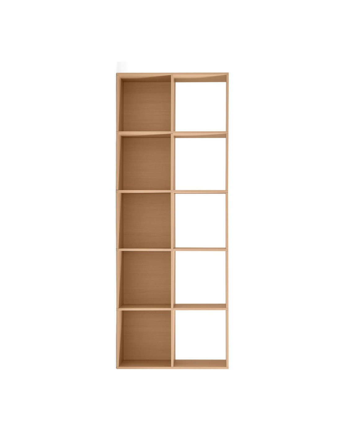 Librero de diseño vertical con estructura en MDF melamina, ideal para organizar libros y objetos decorativos. Su formato estilizado permite optimizar el espacio en distintos ambientes del hogar.