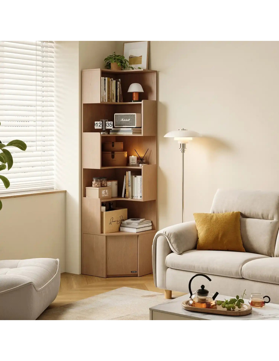Fabricado con MDF melamina, cuenta con 5 niveles que ofrecen espacio para libros, objetos decorativos y artículos de uso diario. Además, incorpora puertas con bisagras de cierre suave, una característica que aporta mayor comodidad y un uso más práctico en el día a día.