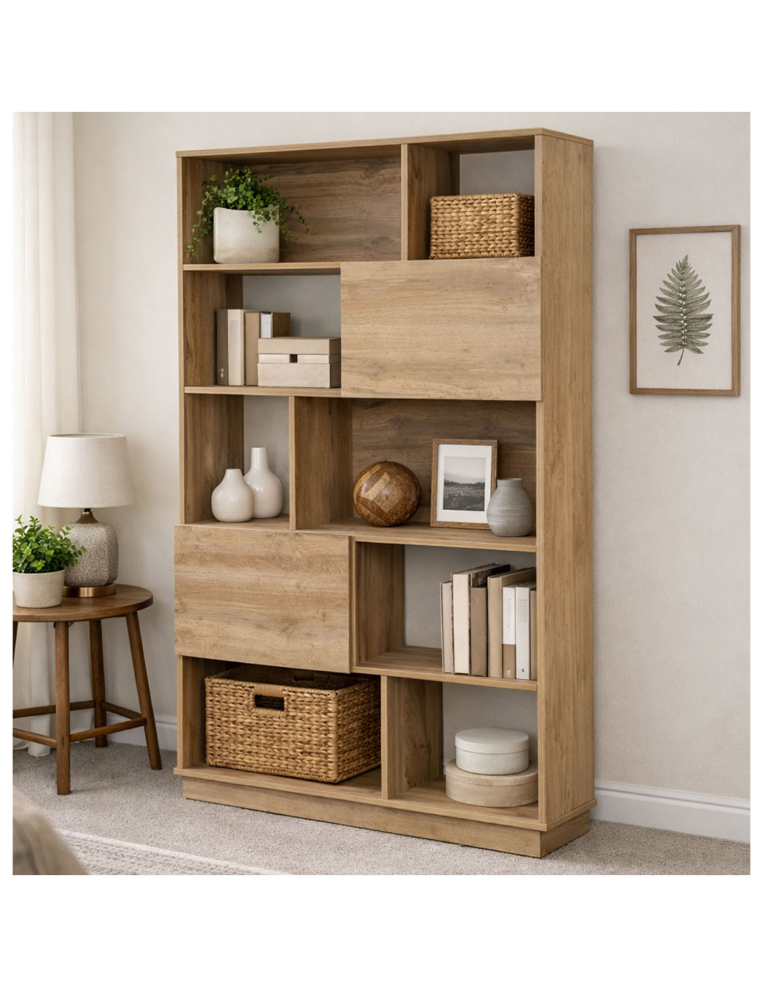 Estante 5 niveles en MDP melamina, ideal para exhibición decorativa y organización vertical en living u oficina.