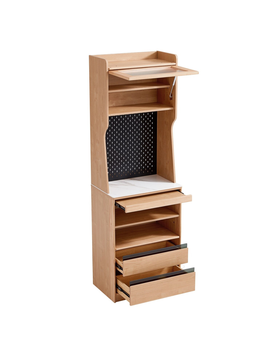 Actualiza la organización de tu cocina con el organizador Miravet 187X59, diseñado para combinar funcionalidad y estilo. Su cubierta de piedra sinterizada brillante resiste el desgaste, el calor y las manchas, facilitando su mantenimiento. Cuenta con un gabinete de apertura hidráulica, estantes ajustables y dos amplios cajones que protegen tus utensilios del polvo. Su bandeja telescópica se despliega fácilmente, mientras que el panel perforado con gestión de cables ofrece un acceso rápido y ordenado.