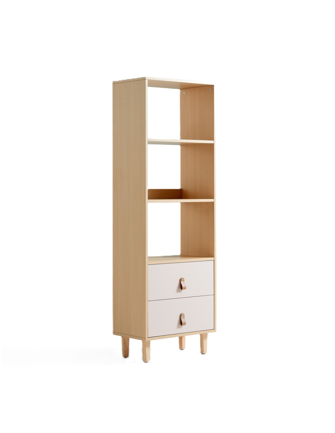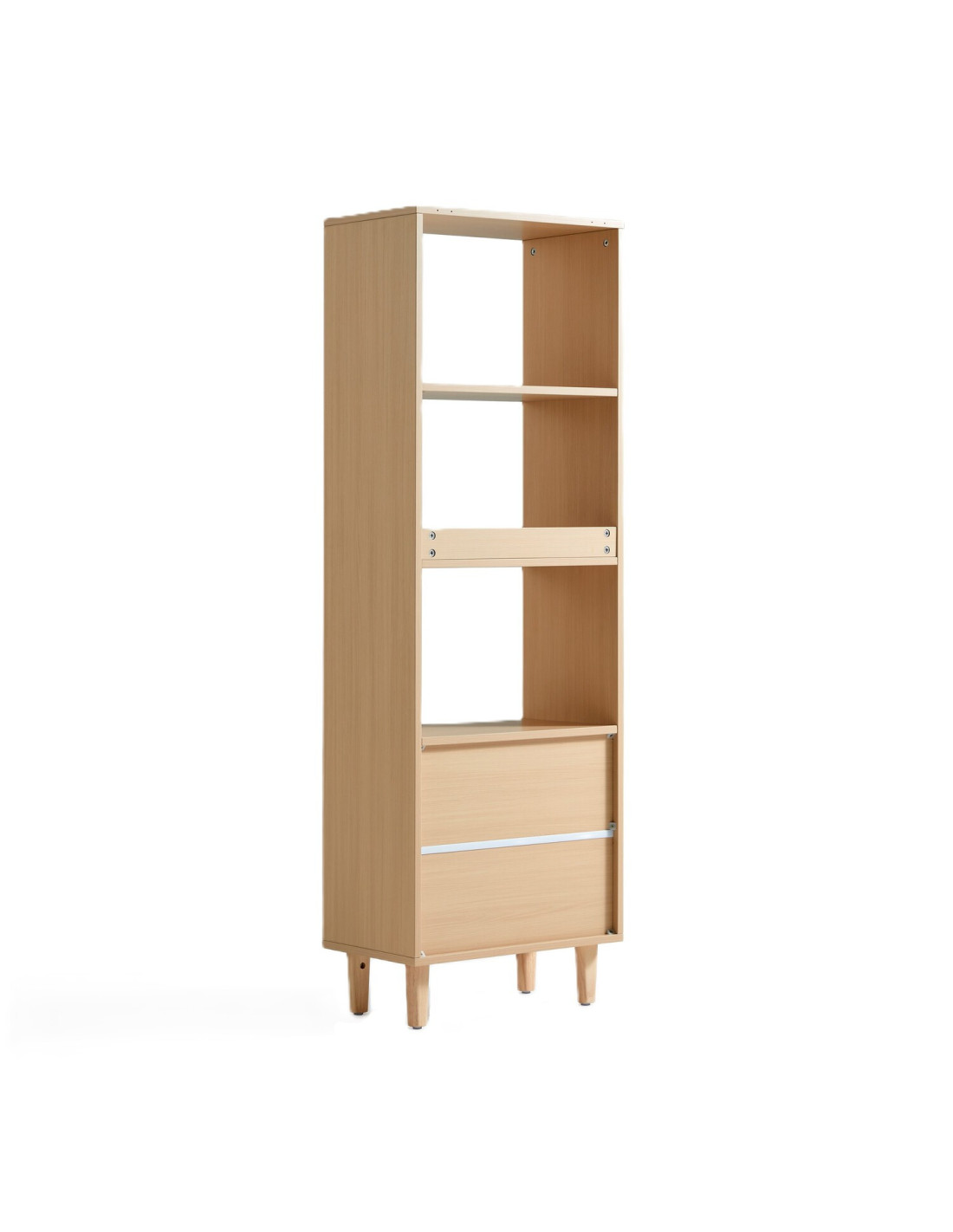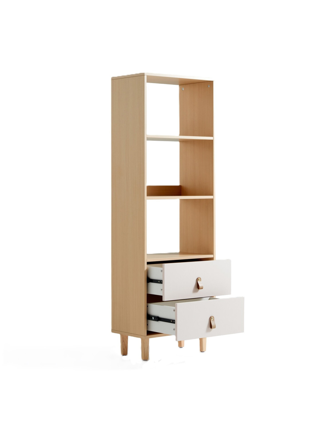 El Estante Mila de 151 cm combina estilo y funcionalidad para transformar cualquier espacio con un diseño elegante y versátil. Su estructura de melamina garantiza durabilidad, mientras que los dos cajones con rieles telescópicos ofrecen un deslizamiento silencioso y almacenamiento discreto para pequeños objetos. Los compartimentos abiertos permiten exhibir libros, colecciones o piezas decorativas con armonía. Elevado sobre patas de madera de caucho, facilita la limpieza del suelo y aporta un toque moderno ideal para el living, la oficina o el dormitorio.