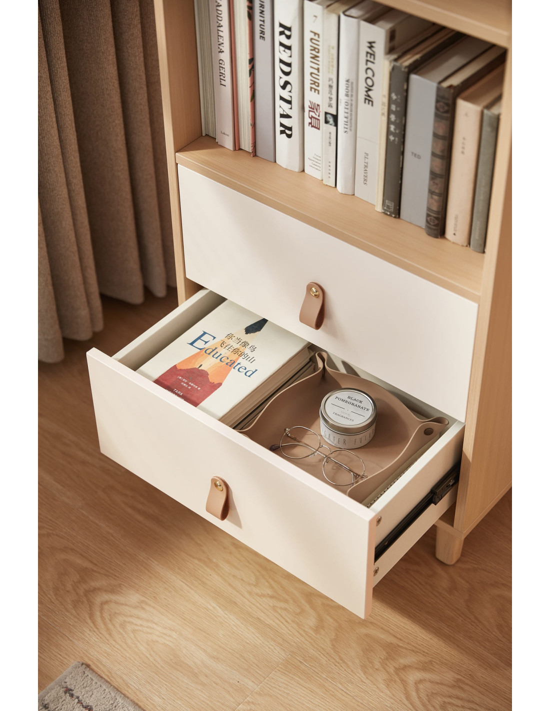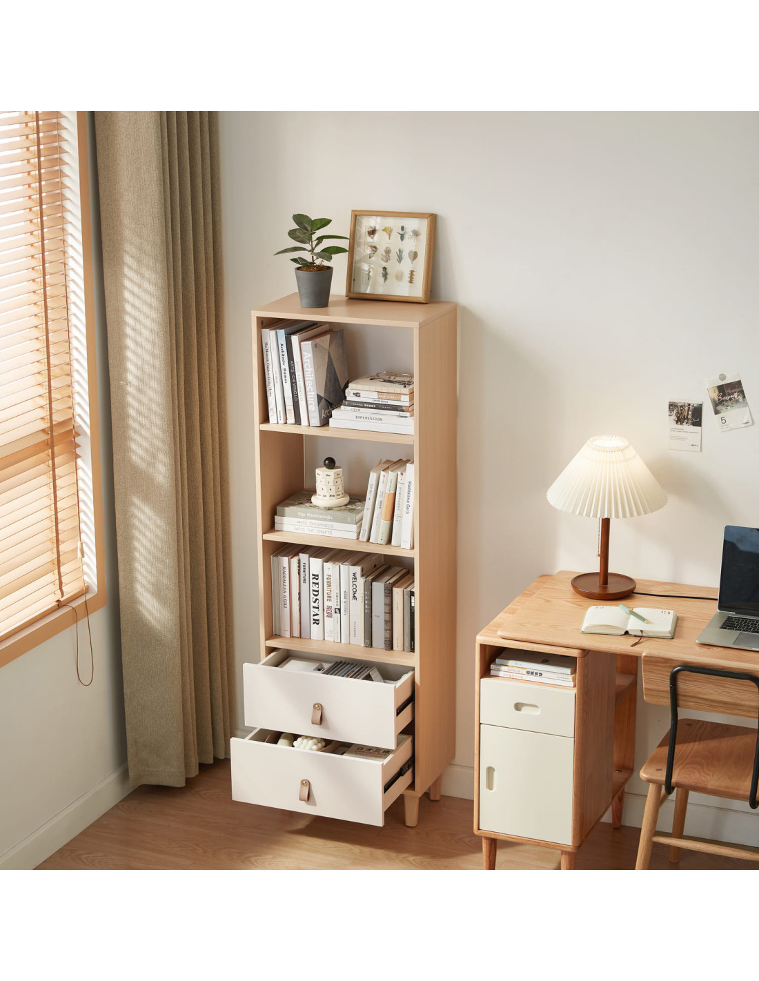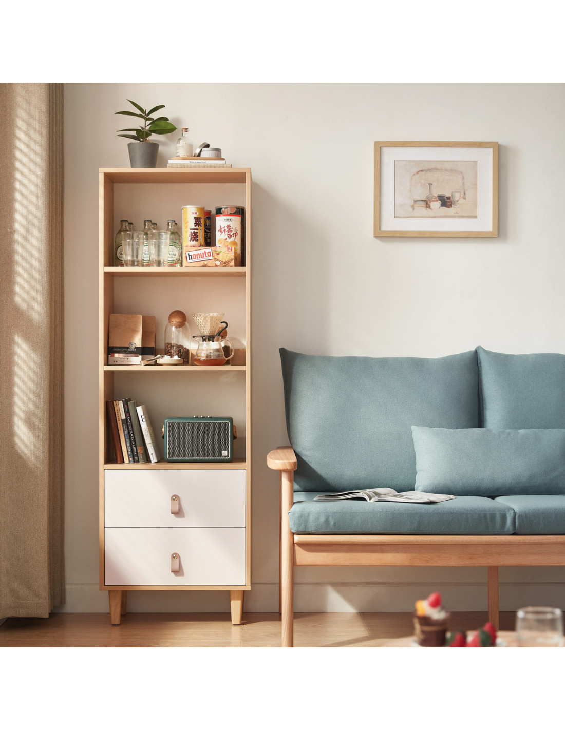 El Estante Mila de 151 cm combina estilo y funcionalidad para transformar cualquier espacio con un diseño elegante y versátil. Su estructura de melamina garantiza durabilidad, mientras que los dos cajones con rieles telescópicos ofrecen un deslizamiento silencioso y almacenamiento discreto para pequeños objetos. Los compartimentos abiertos permiten exhibir libros, colecciones o piezas decorativas con armonía. Elevado sobre patas de madera de caucho, facilita la limpieza del suelo y aporta un toque moderno ideal para el living, la oficina o el dormitorio.