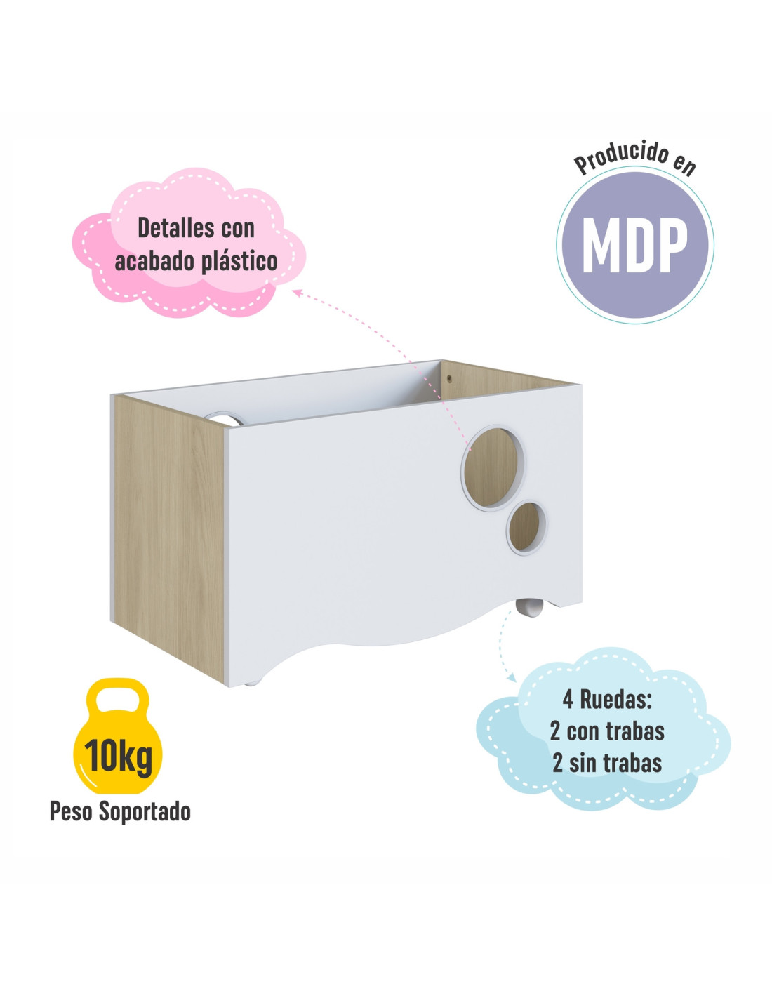 La Caja de Juguetes con Ruedas Línea Encanto es la solución ideal para mantener el cuarto de tu bebé ordenado y armonioso. Su diseño versátil y práctico permite guardar y organizar esos juguetes que suelen quedar esparcidos, facilitando la rutina diaria. Con dos ruedas con freno y dos sin freno, puedes moverla cómodamente o dejarla fija cuando lo necesites. Fabricada para aportar funcionalidad y estilo, se entrega desmontada para un armado sencillo.