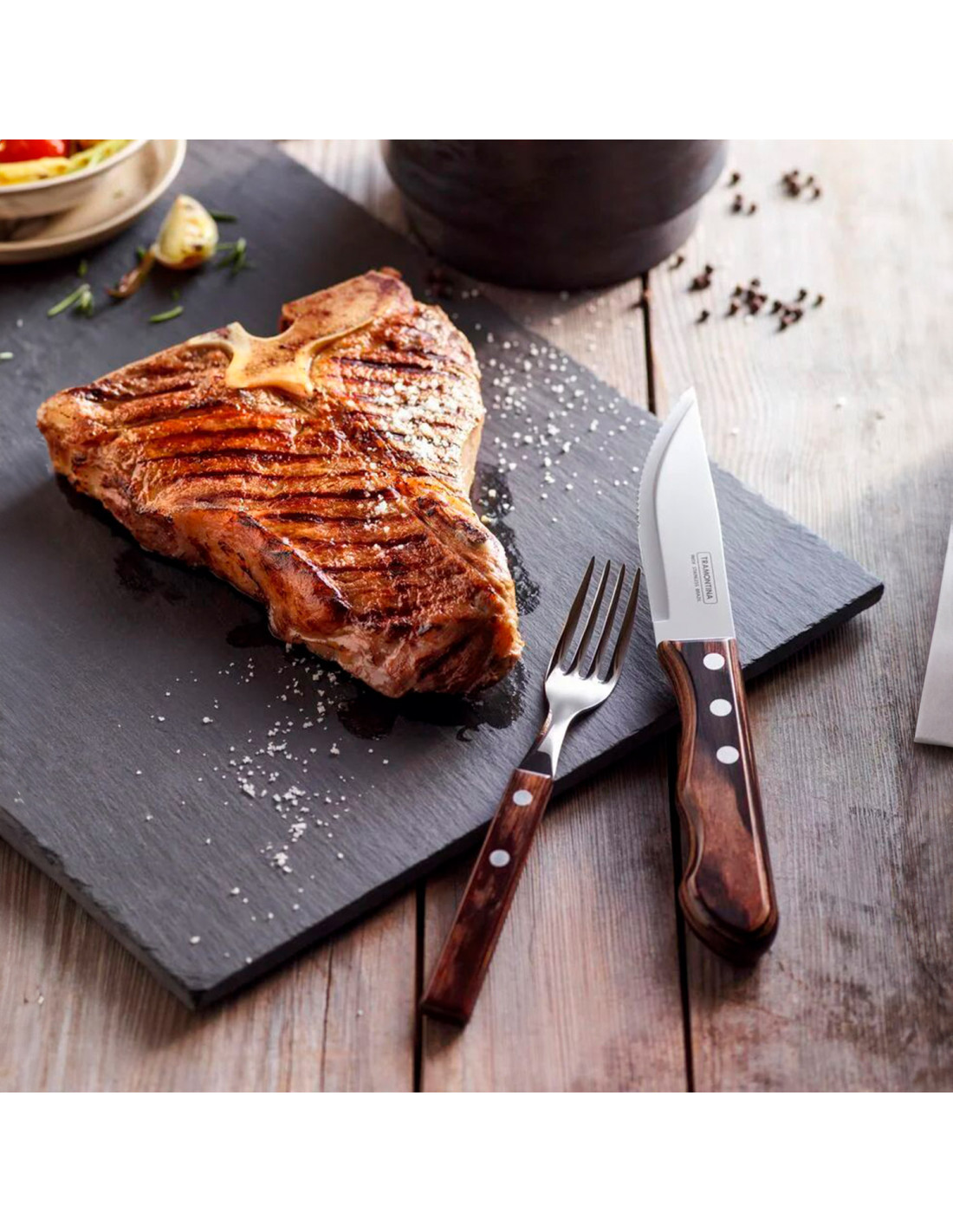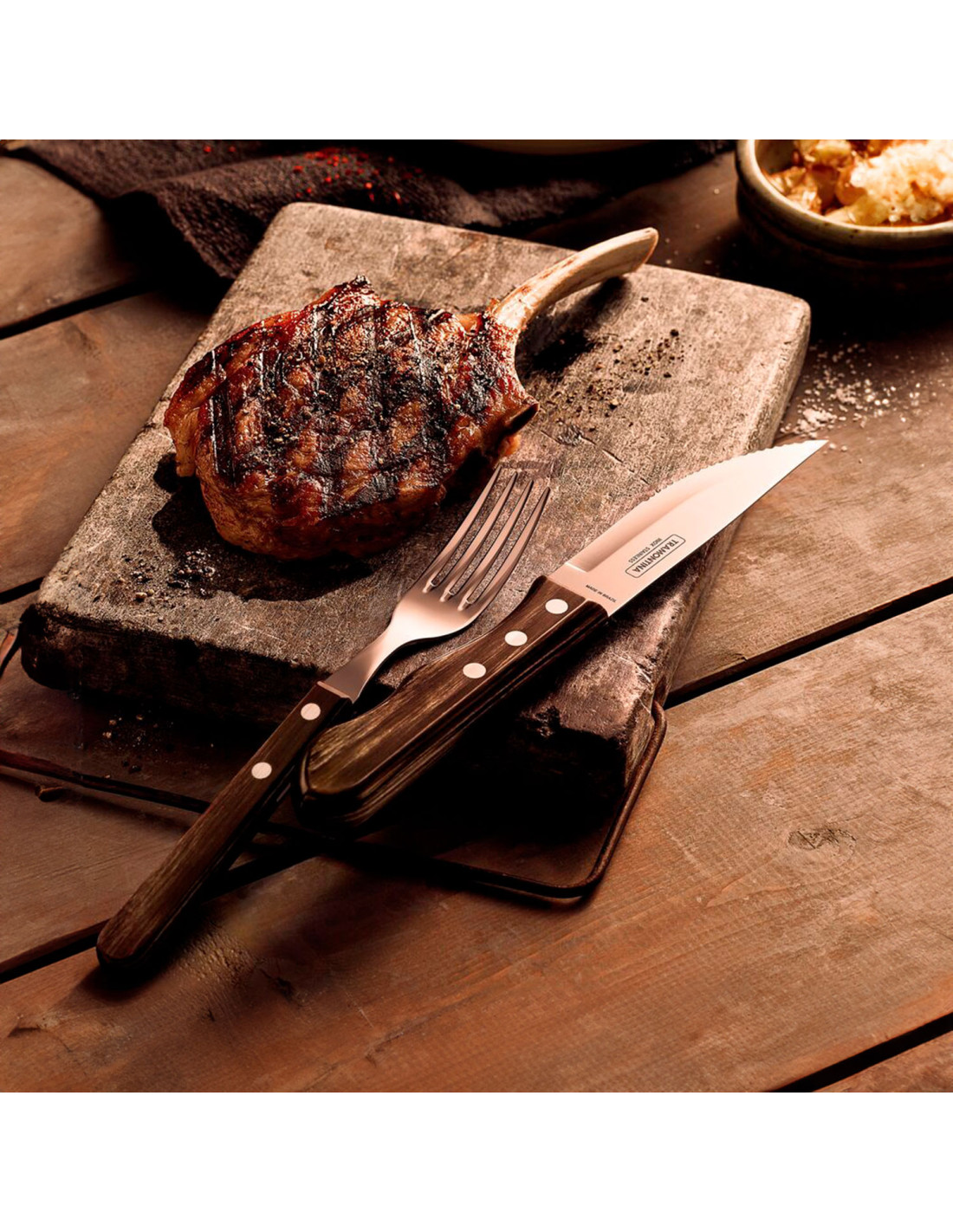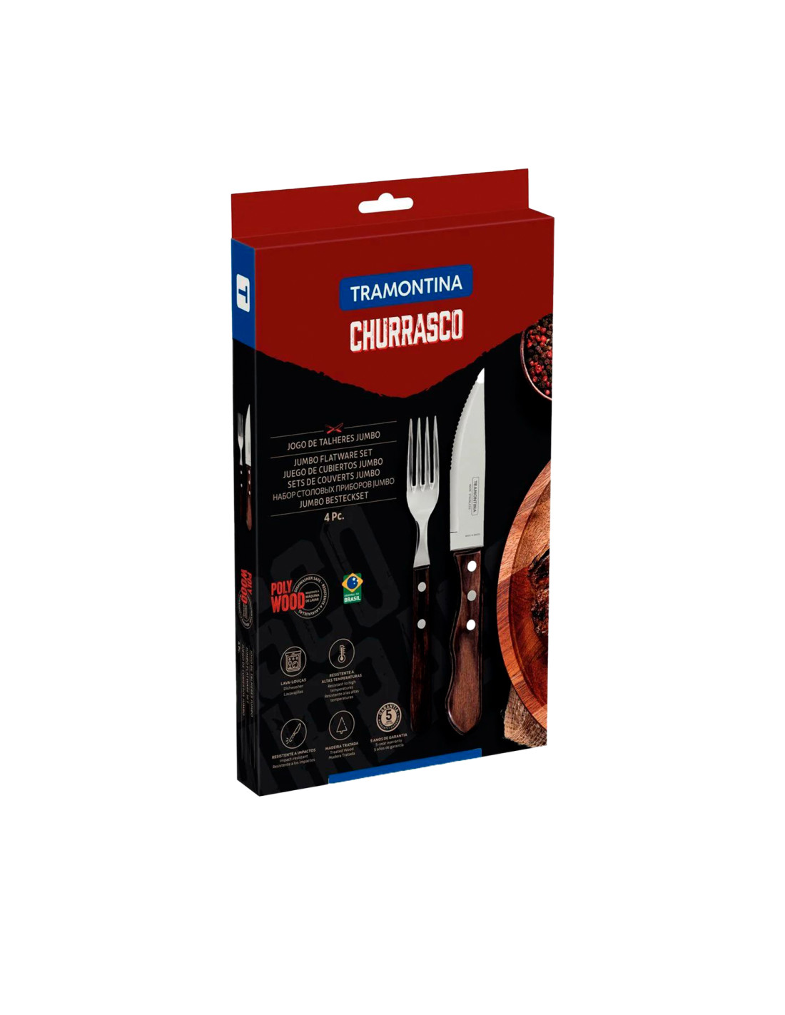 Diseñado para transformar su asado en un momento sorprendente. El juego de cubiertos Jumbo para asado Tramontina de la línea Churrasco, está fabricado con acero inoxidable y cuentan con mango castaño de Polywood. Le aportará a su mesa más calidad y belleza. Además, es resistentes a impactos y altas temperaturas. Las piezas están fabricadas con láminas de acero inoxidable, por lo que proporcionan mayor resistencia y durabilidad.