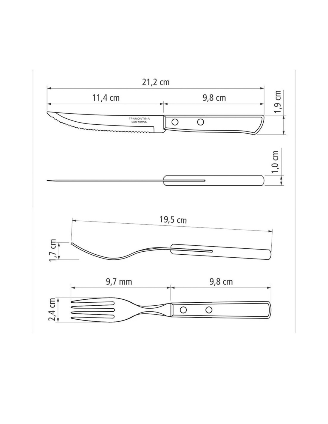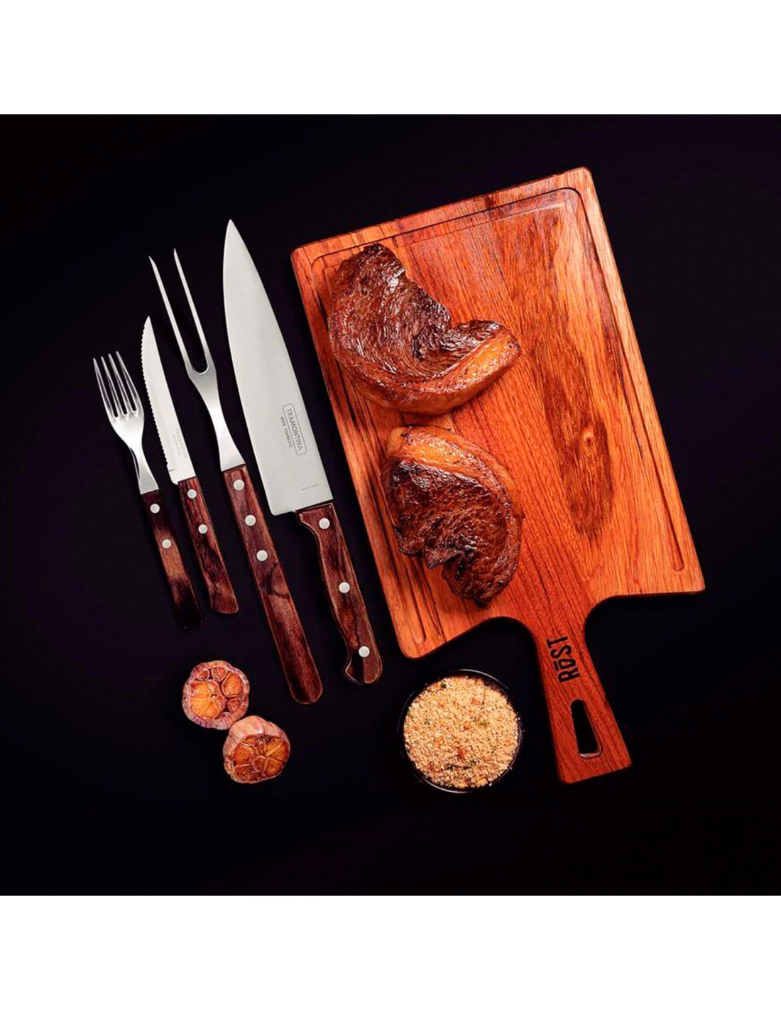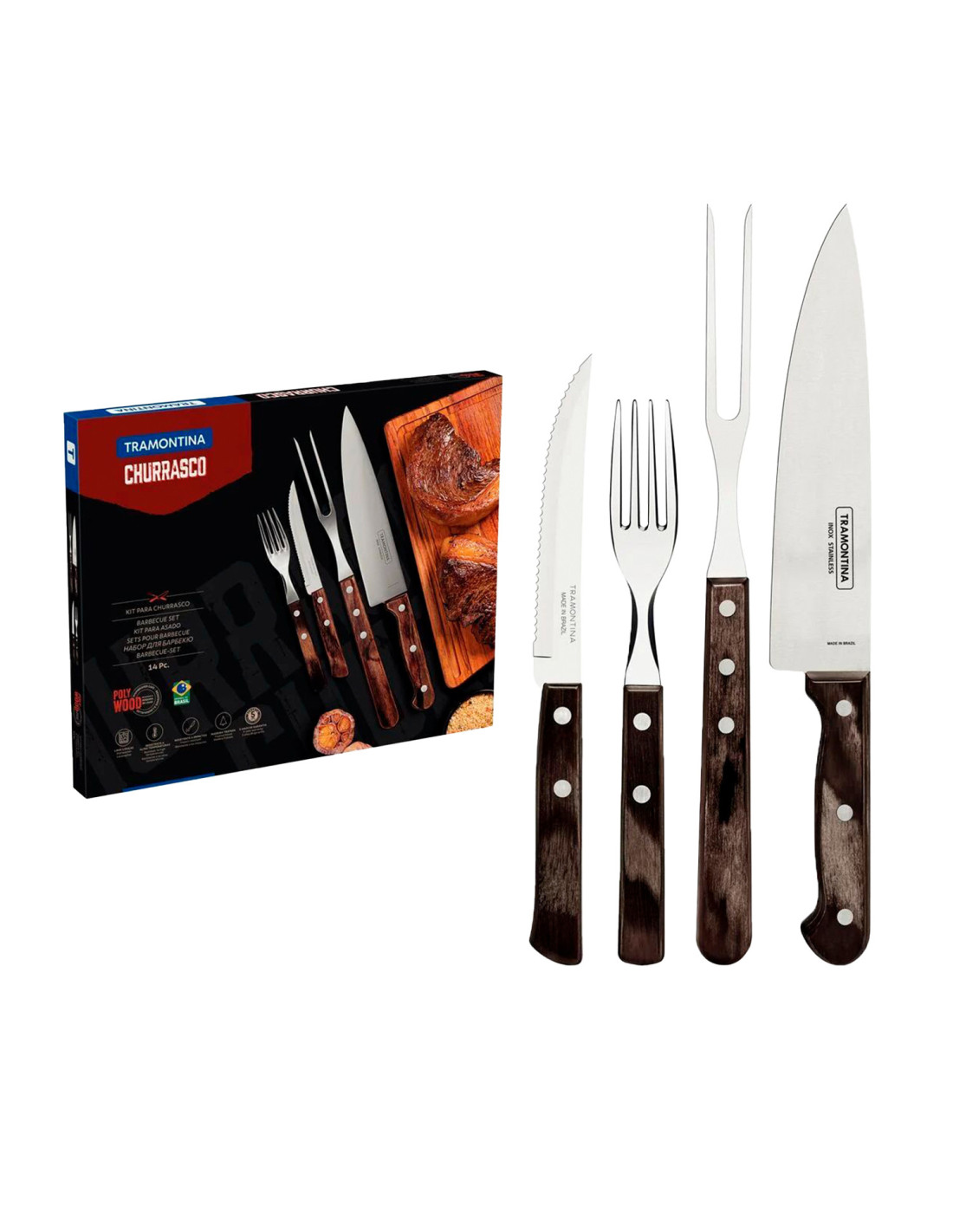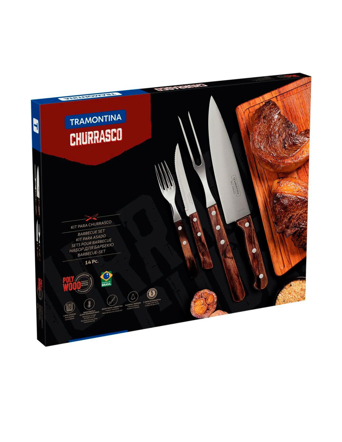 El juego para asado de 14 piezas Tramontina cuenta con cubiertos fabricados con acero inoxidable y mangos de Polywood. Incluye los utensilios esenciales para los que desean preparar y servir un asado de calidad. Estas características garantizan resistencia a impactos y altas temperaturas, las piezas dejarán su mesa todavía más sofisticada.
