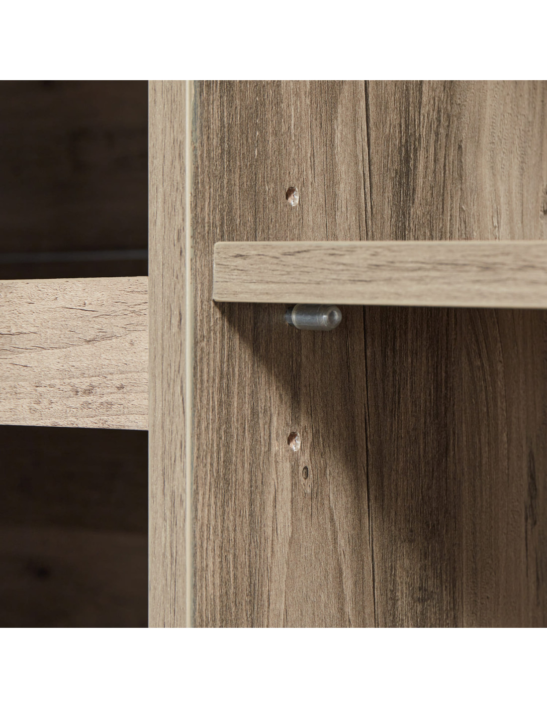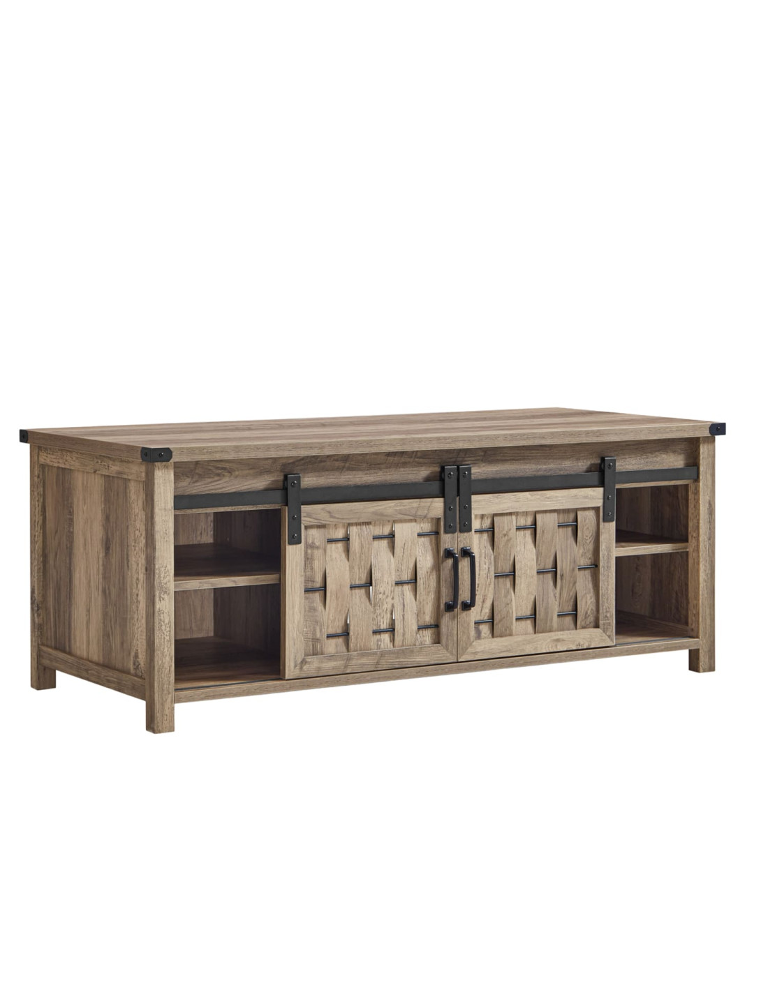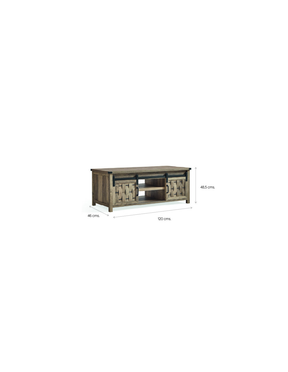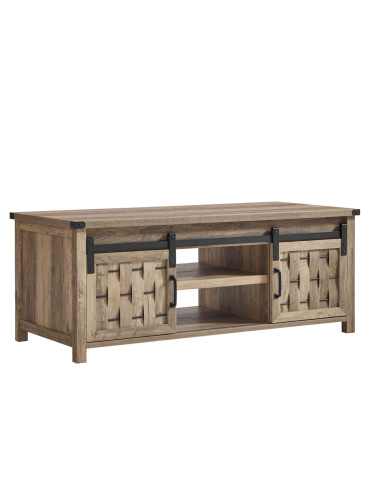 La mesa de centro Vinh café combina un diseño rústico con toques modernos, convirtiéndose en el punto focal de tu sala de estar. Su acabado en madera con patrones entretejidos y detalles metálicos en los bordes aportan carácter y calidez. Las dos puertas correderas permiten un acceso fácil a los compartimentos, cada uno con estantes ajustables para adaptarse a tus necesidades. Los orificios para cables mantienen el orden, mientras los niveladores ajustables aseguran estabilidad en cualquier superficie. Fabricada con tablero de partículas P2 y MDF laminado, esta mesa ofrece una robustez excepcional.