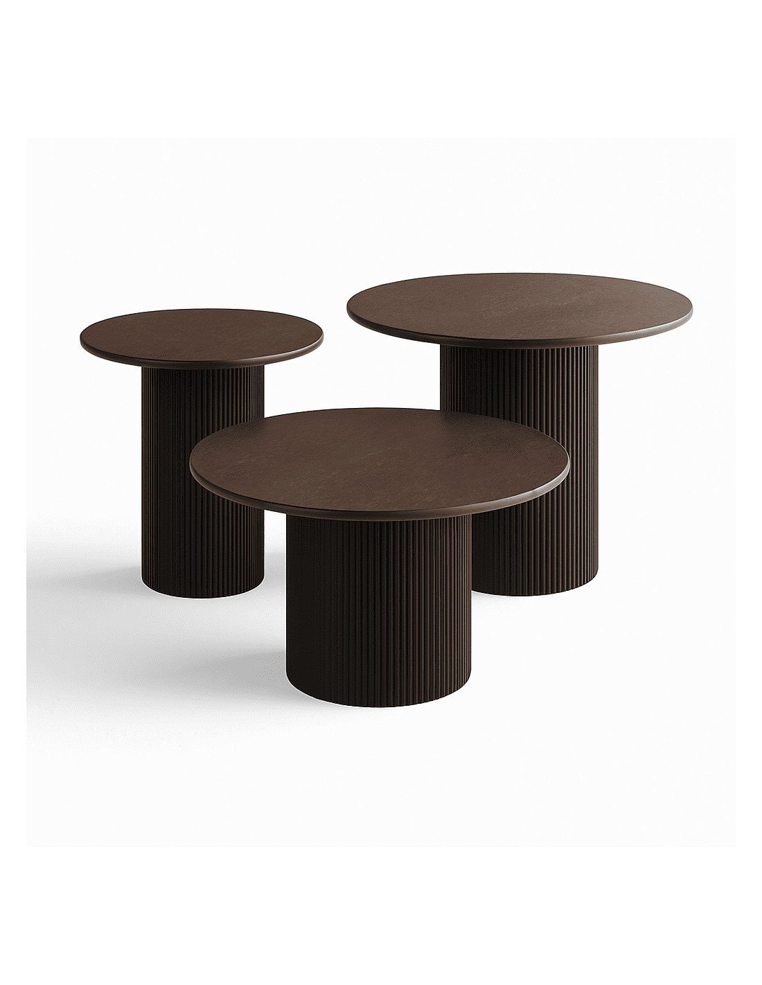 Con un diseño contemporáneo y una silueta escultural, la mesa centro Mamoré transforma el living en un espacio de estilo y equilibrio. Su cubierta redonda y base cilíndrica con textura acanalada crean una pieza distintiva que destaca por su presencia. Fabricada con tableros de fibra de madera, es una mesa de centro moderna ideal para quienes buscan muebles de diseño que combinan elegancia y funcionalidad.
