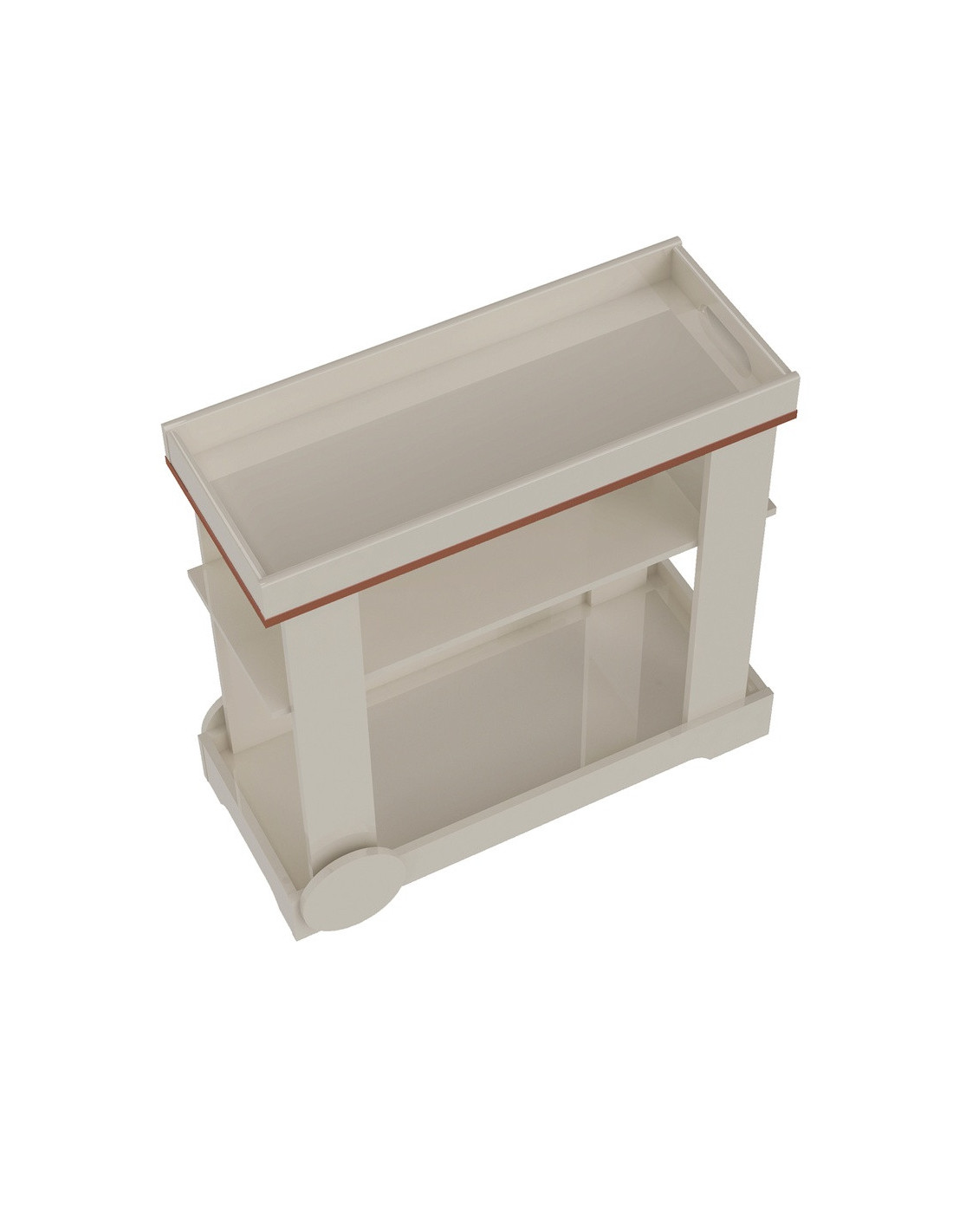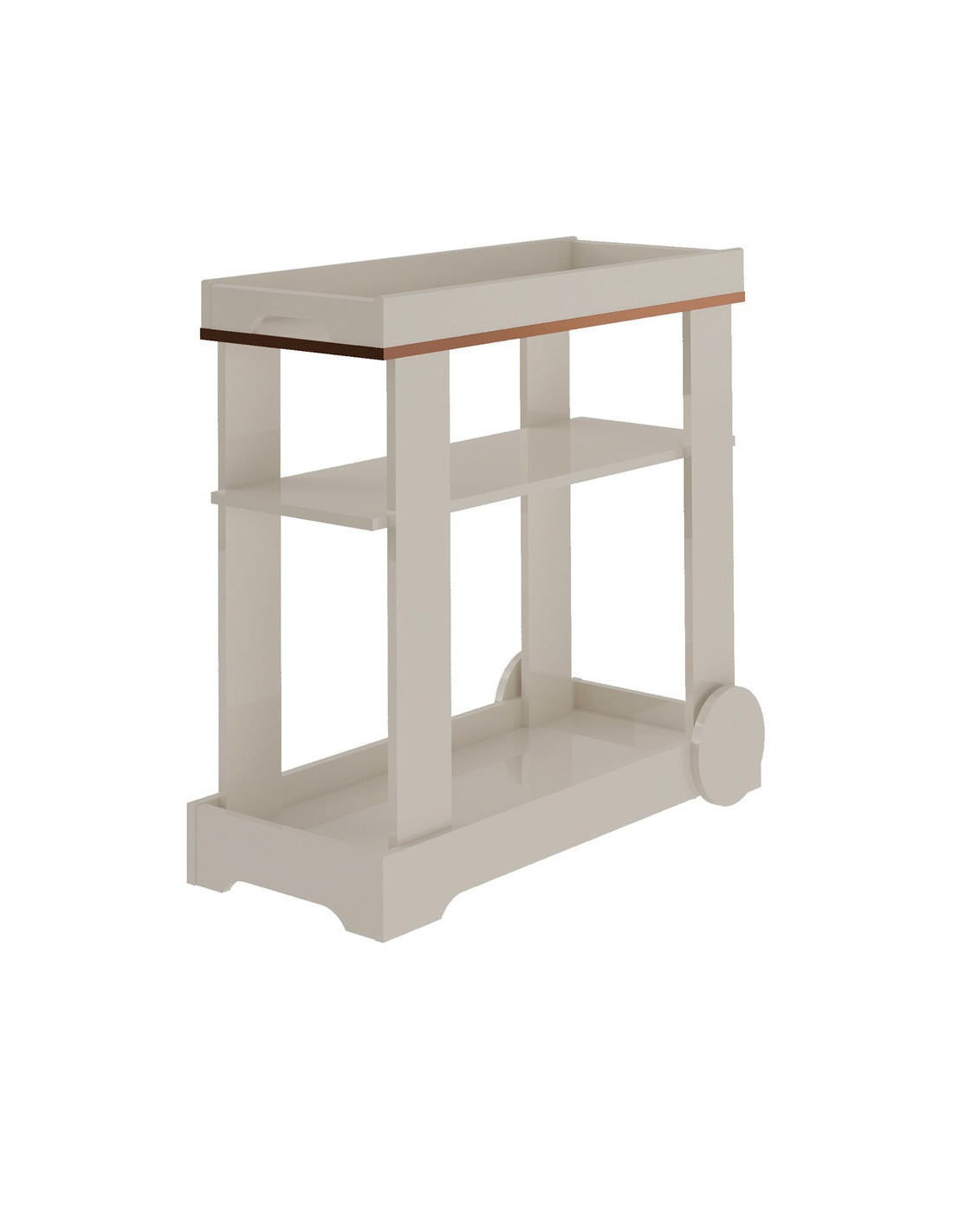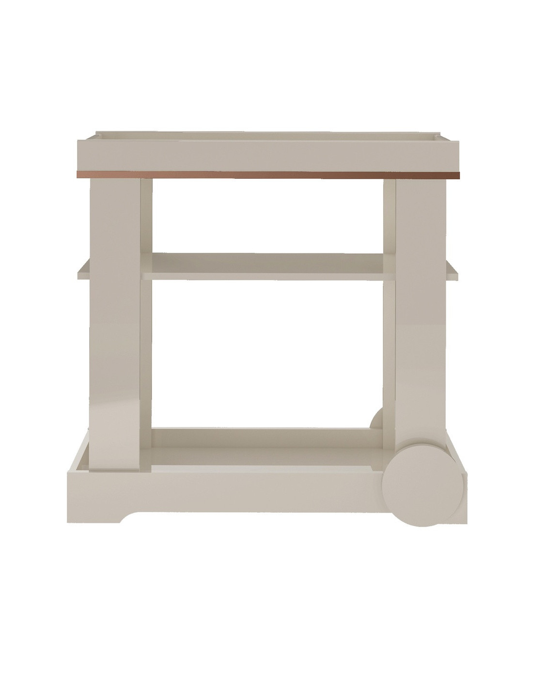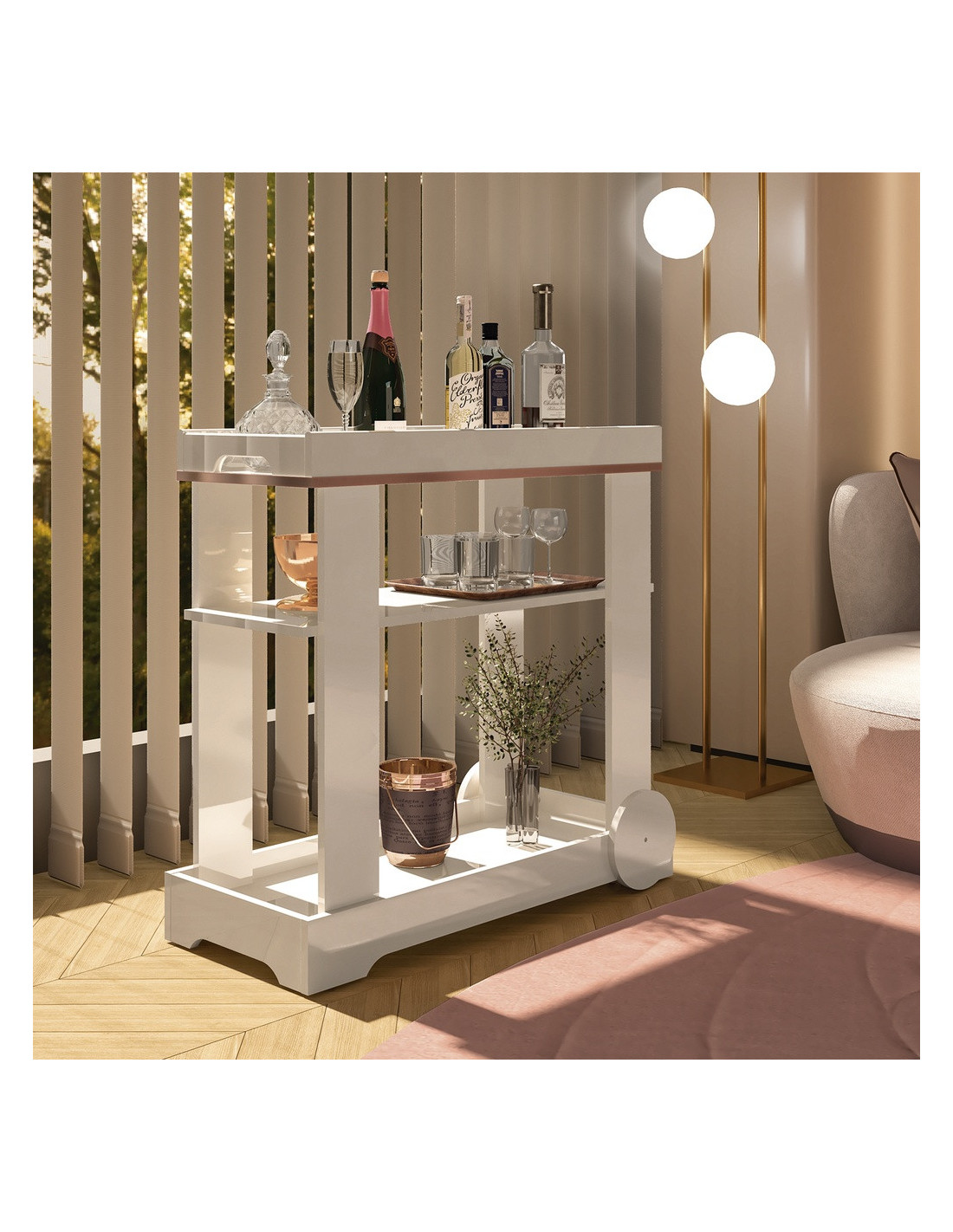 El Carro Bar Rosé es la pieza perfecta para elevar tus espacios con un toque de sofisticación y estilo. Su diseño destaca por la cinta de borde metalizada en la parte superior, un detalle sutil y elegante que marca la diferencia y transforma este mueble en un verdadero protagonista decorativo.