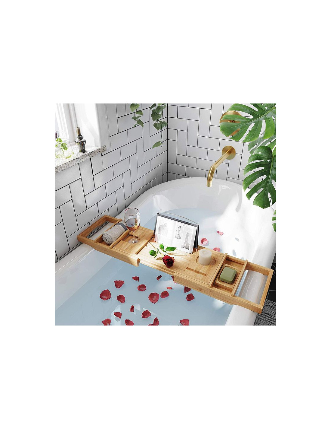 Bandeja extensible de bambú, diseño natural y funcional que transforma tu baño en un espacio de bienestar.