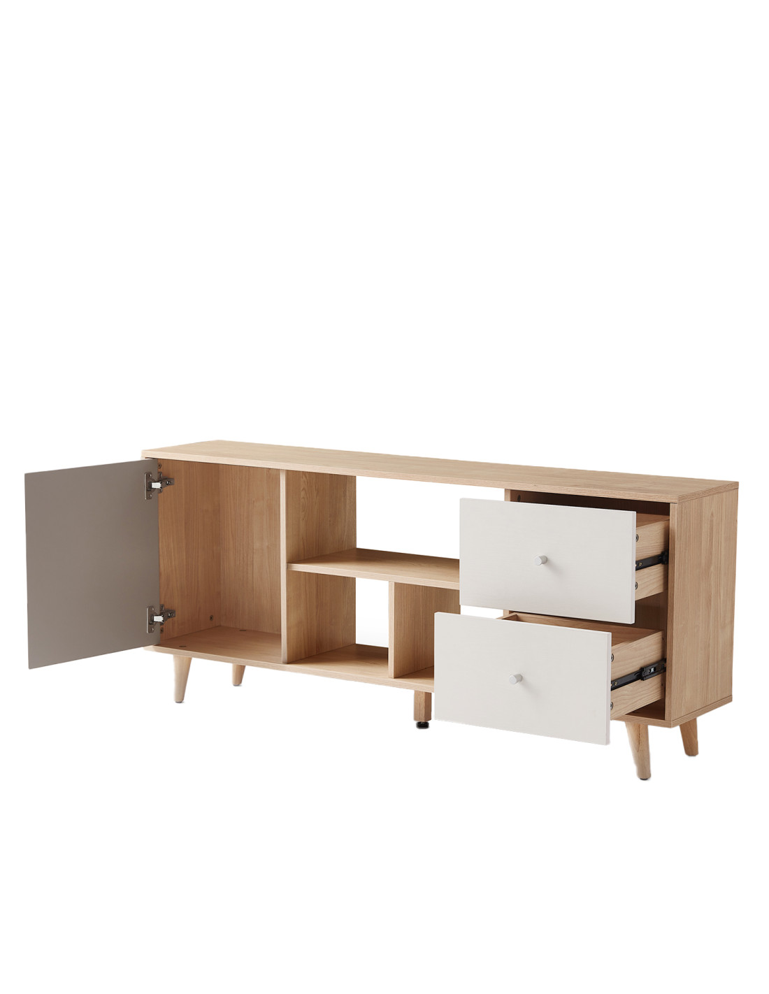 Disfruta de la elegancia funcional del Rack TV Tokyo, diseñado con precisión para combinar estilo y practicidad en tu espacio. Cada detalle está cuidadosamente elaborado con tableros de melamina, que garantizan durabilidad y un acabado impecable en cada panel, desde el frontal hasta el trasero. Los materiales auxiliares incluyen madera de caucho, que proporciona una base sólida y estable, complementada con herrajes de alta calidad como guías de bola de tres secciones y pies ajustables que aseguran un movimiento suave y una estabilidad óptima. Los elegantes mangos de aluminio mate plateado y las bisagras de puerta con amortiguadores curvos grandes añaden un toque de modernidad y funcionalidad silenciosa. Descubre cómo el Rack TV Tokyo no solo transforma tu espacio de entretenimiento, sino que también eleva tu experiencia diaria con un diseño que combina belleza y utilidad de manera armoniosa.